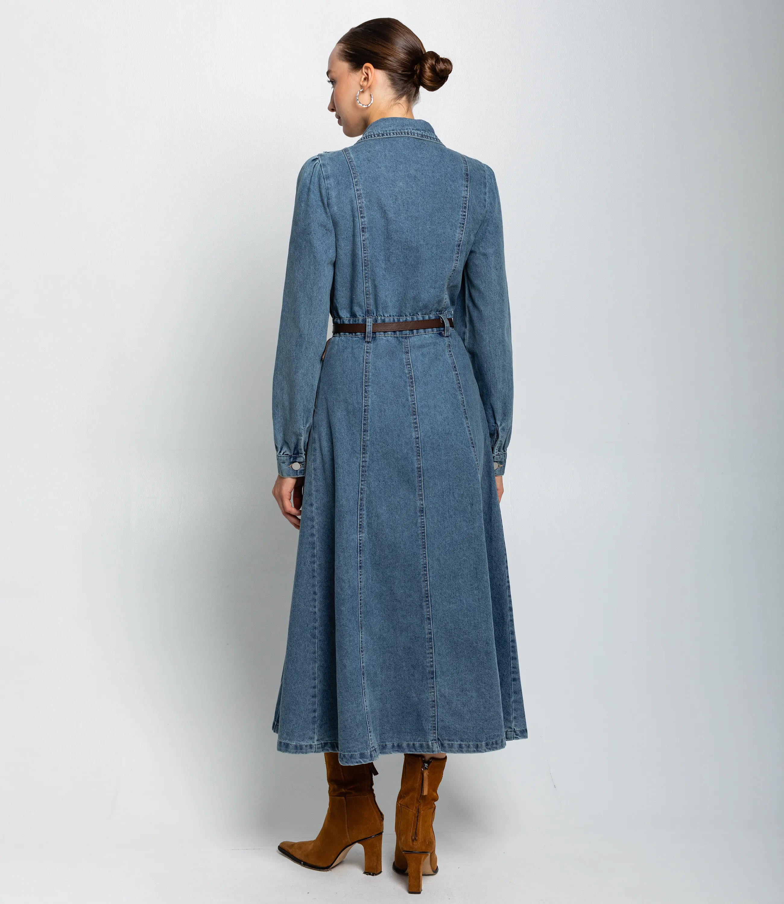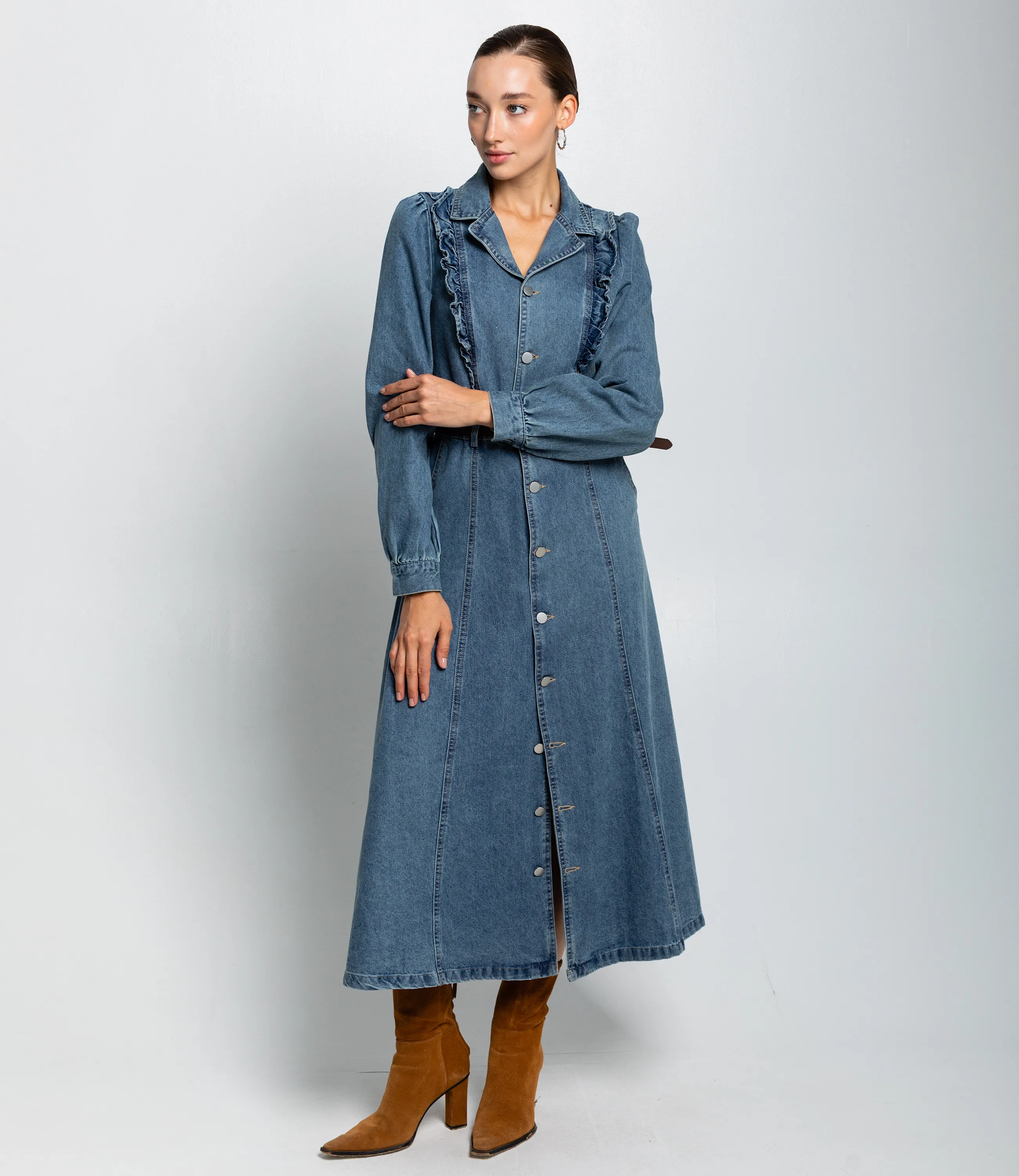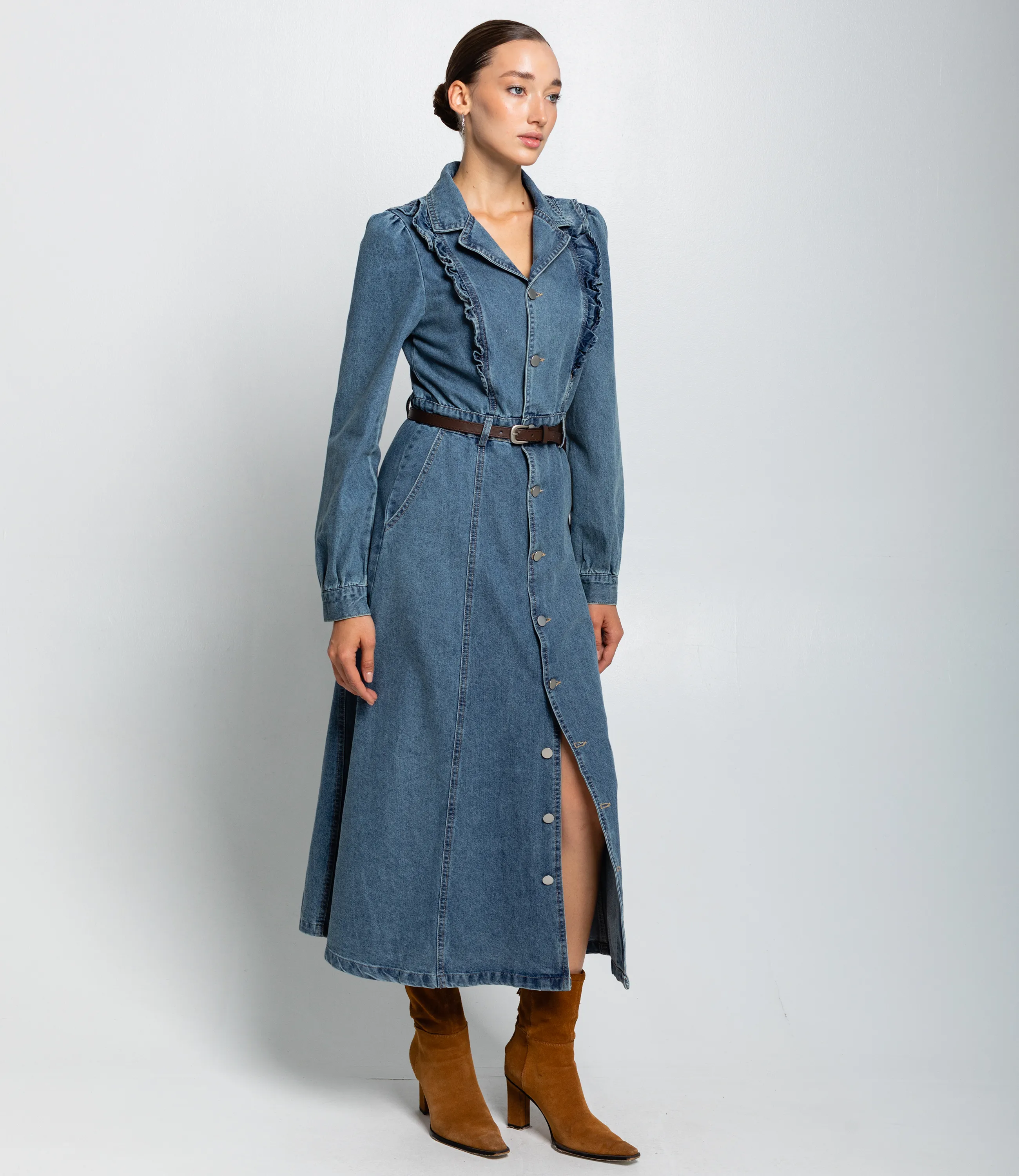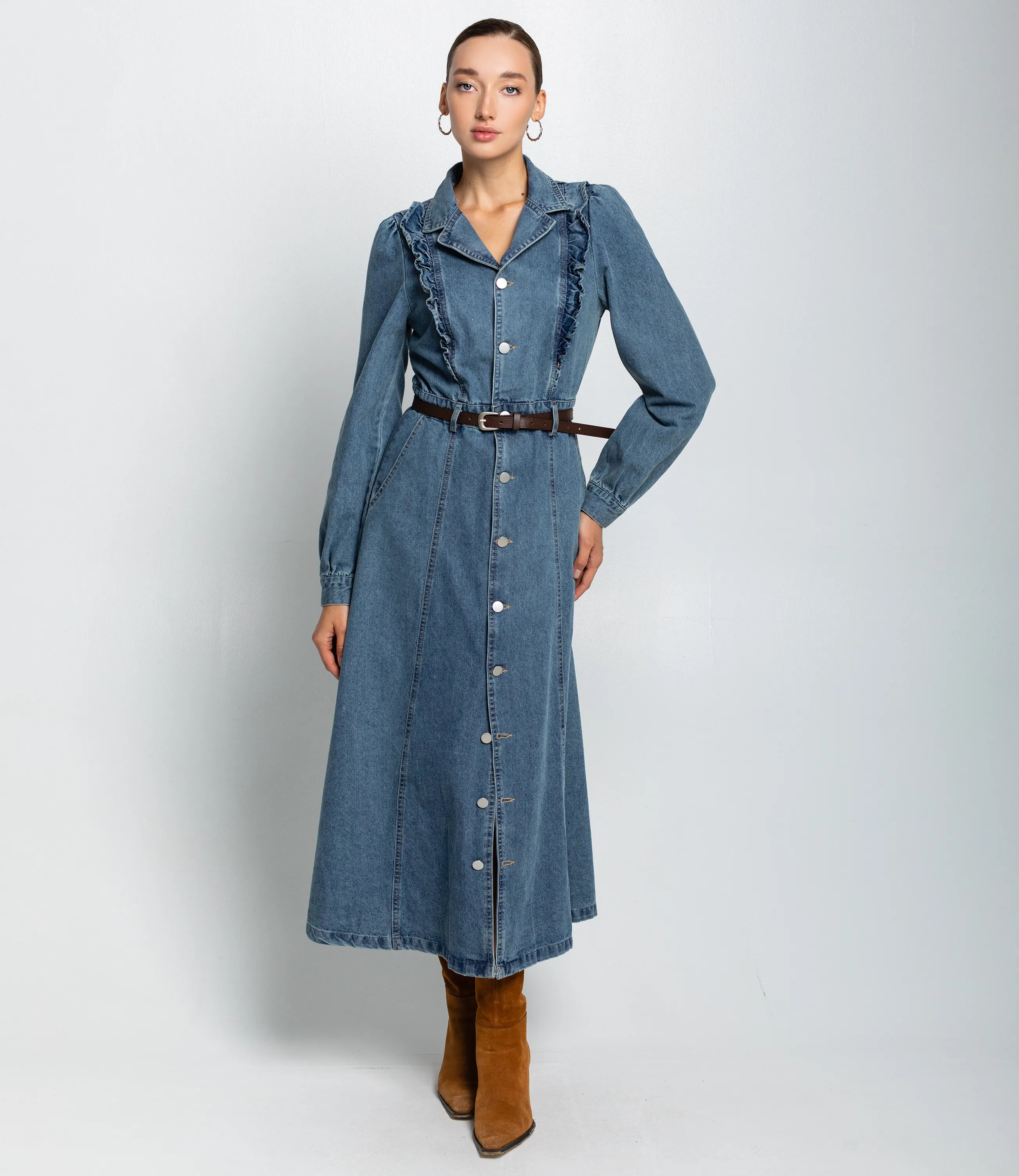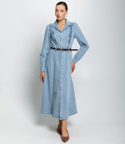 Платье – это вещь, которая подчеркивает женственность каждой представительницы прекрасного пола. Данная модель платья с коротким рукавом отлично подойдет для летнего сезона. Платье длиной макси‑миди до щиколоток с приталенным силуэтом и лёгким расклёшенным подолом, застёгивается по всей длине на ряд крупных пуговиц. Отложной воротник с небольшим лацканом, образует V‑образный вырез при расстёгнутых верхних пуговицах. Длинные слегка объёмные рукава с небольшим сбором в плечевой зоне, манжеты на пуговице, аккуратная длина до запястья. Вертикальные швы и рельефы от плеч к талии создают приталивание; тонкий ремень подчёркивает талию и добавляет структурности силуэту. Декоративные рюши вдоль передних рельефных швов у груди, видимая строчка по швам, функциональные наклонные карманы в боковых швах на уровне бёдер. Плавно расширяющийся подол со свободной посадкой для удобства движений. Для изготовления использована ткань 100% хлопок, которая характеризуется отличным качеством. Даже после многих стирок платье не потеряет изначальной красоты. Вы обязательно будете его носить с удовольствием. Обратите внимание на цвет джинсового платья. Он является насыщенным и полностью соответствует фото на сайте. Чтобы вы были уверены в размере, мы предоставили на сайте таблицу. Воспользовавшись ею, вы сможете самостоятельно обмерить себя и удостовериться. Установленная нами цена является приемлемой. Не откажите себе в удовольствии быть неповторимой! Рост 168 см, 85-63-92. Вы можете заказать онлайн презентацию на интересующие Вас модели. Наши менеджеры свяжутся с Вами и проведут индивидуальную видеотрансляцию, помогут составить заказ и ответят на Ваши вопросы.