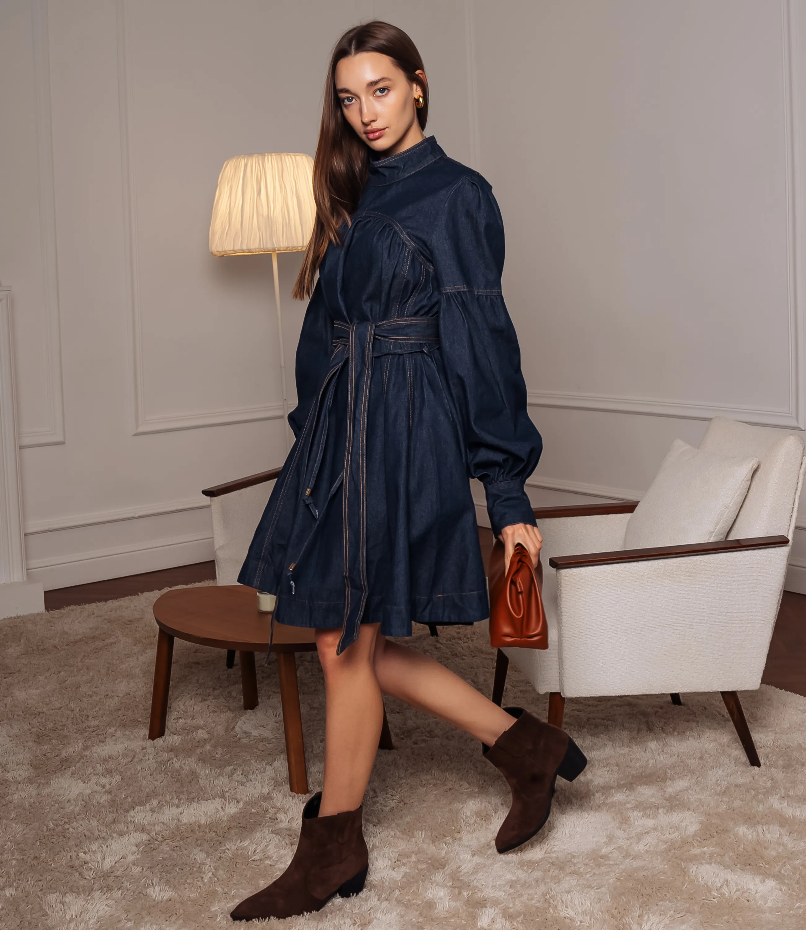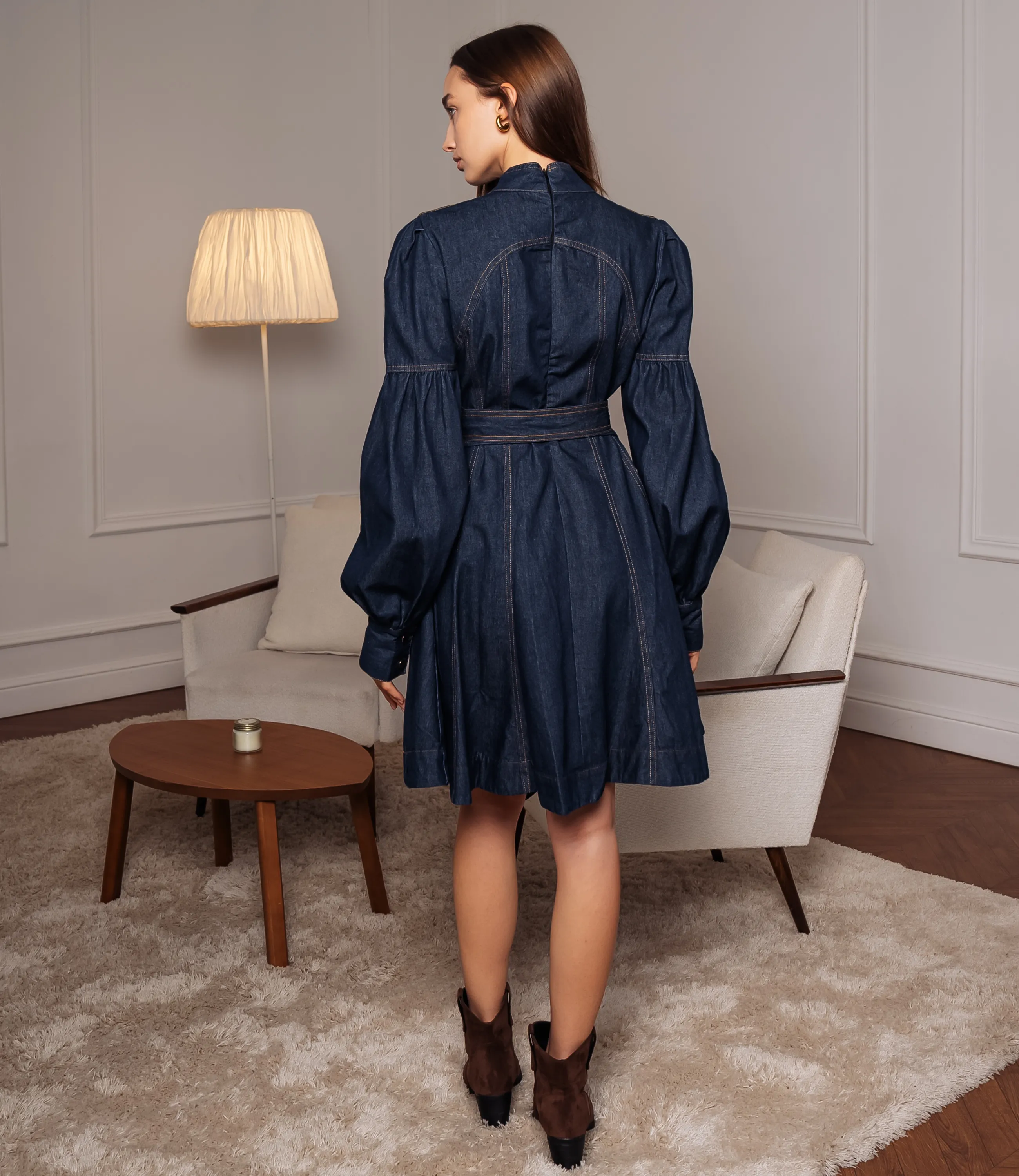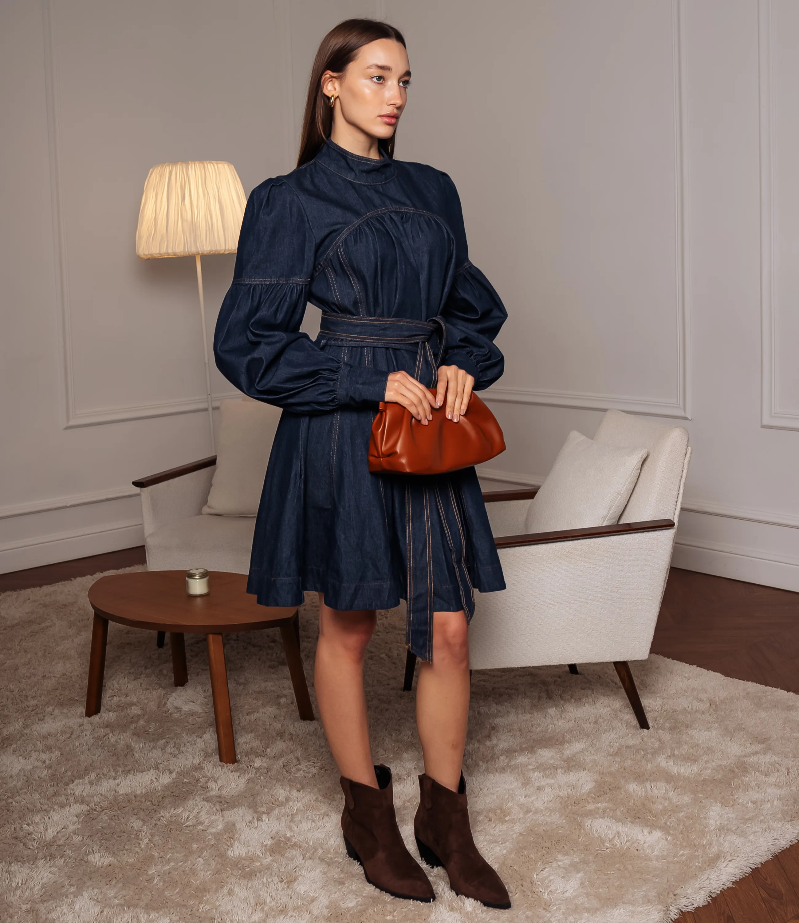 Платье – это вещь, которая подчеркивает женственность каждой представительницы прекрасного пола. Платье приталенного кроя с лёгким расклешением от талии до середины бедра; длина платья чуть выше колена. Верхняя часть имеет высокий стойку‑воротник и кокетку на уровне груди с мягкими сборками, создающими объем по центру лифа. Рукава длинные, втачные, с выраженным объёмом в нижней части — от линии локтя они расширяются в широкие фонарные рукава, собирающиеся в узкие манжеты на запястье. По линии талии проходит отрезная шлица и съёмный пояс из той же ткани, завязывающийся спереди узлом или бантом; пояс оформлен петлями‑держателями на боковых швах. Для изготовления использована ткань 100% хлопок, которая характеризуется отличным качеством. Даже после многих стирок платье не потеряет изначальной красоты. Вы обязательно будете его носить с удовольствием. Обратите внимание на цвет джинсового платья. Он является насыщенным и полностью соответствует фото на сайте. Чтобы вы были уверены в размере, мы предоставили на сайте таблицу. Воспользовавшись ею, вы сможете самостоятельно обмерить себя и удостовериться. Установленная нами цена является приемлемой. Не откажите себе в удовольствии быть неповторимой! Рост 168 см, 85-63-92. Вы можете заказать онлайн презентацию на интересующие Вас модели. Наши менеджеры свяжутся с Вами и проведут индивидуальную видеотрансляцию, помогут составить заказ и ответят на Ваши вопросы.