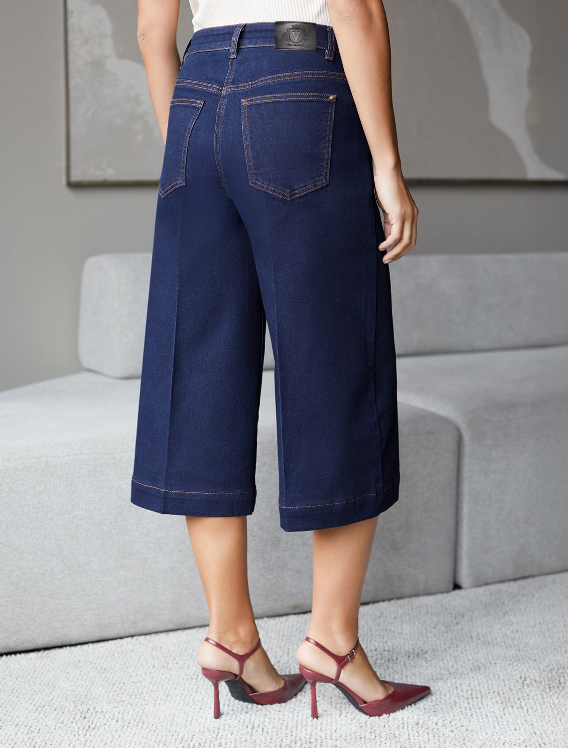 Свободные джинсовые бермуды насыщенного темно-синего цвета из эластичного денима обеспечивают комфорт и стиль в повседневном образе. Длинные классические шорты с пятью карманами выполнены с широким подгибом по низу и со стрелками по всей длине, что эффектно удлиняет ноги и визуально стройнит силуэт. Правильная посадка и классический фасон подходит как для маленьких, так и для больших размеров. Материал эластичен, благодаря чему шорты отлично садятся по фигуре и не сковывают движения, обеспечивает долговечность изделия, сохраняя первоначальный вид даже после многократных стирок и активного использования. Шорты дополнены качественной фуртитурой и брендированным патчем из эко-кожи на поясе.