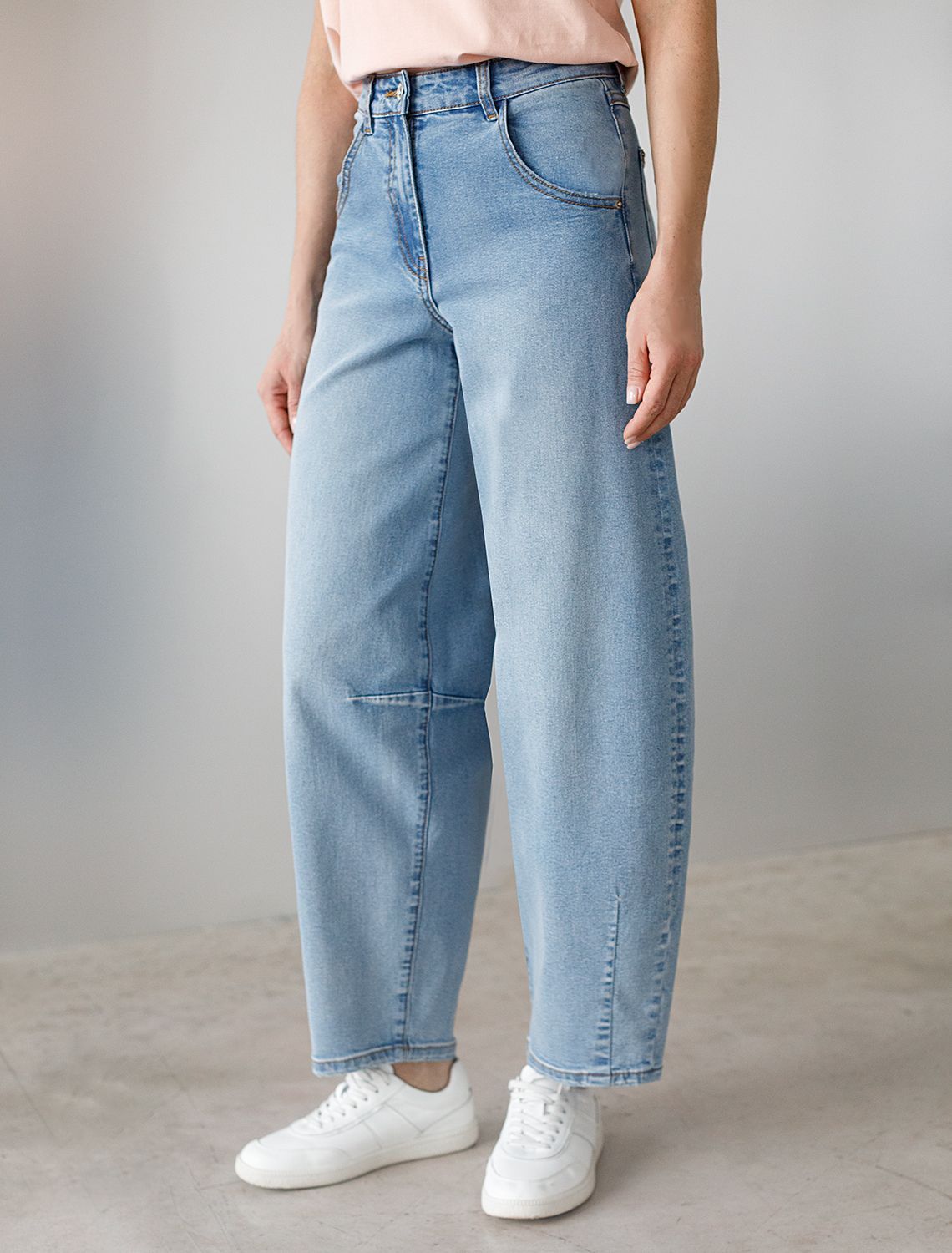 Джинсы баррель с декоративной стиркой из эластичного денима