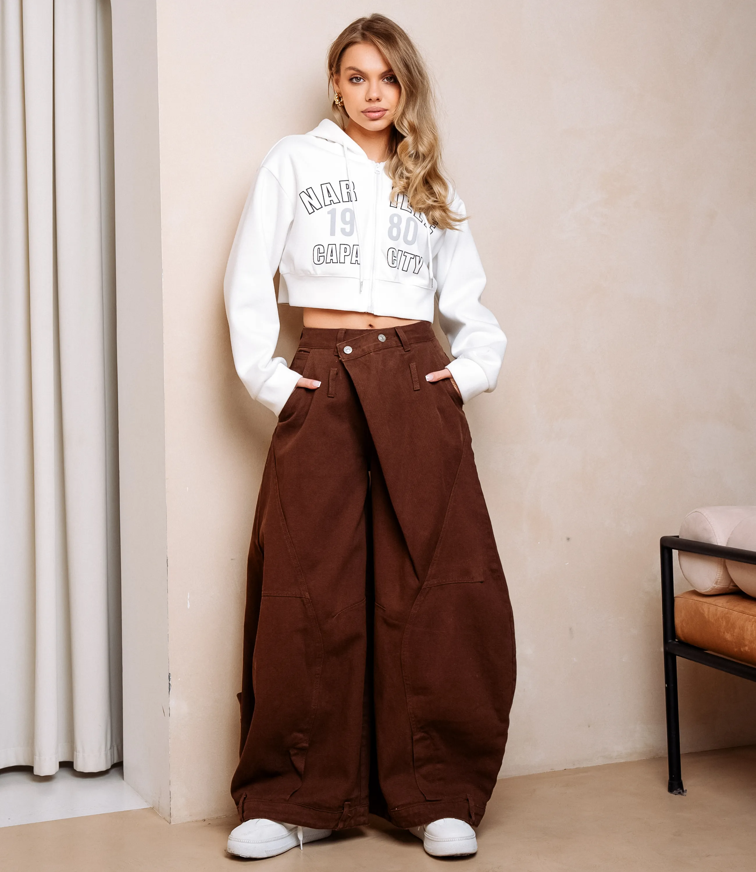 Джинсы — это часть гардероба, которая подчёркивает привлекательность каждой женщины. Джинсы свободного экстремально широкого кроя с высокой посадкой и сильно заниженной линией шага, формирующие объём от бёдер до пола и собирающиеся складками у щиколоток; широкий пояс с продольными шлевками и двумя видимыми металлическими кнопками на передней части, застёжка скрытая под планкой. Для пошива использована ткань 65% хлопок и 35% полиэстера. На странице представлена таблица размеров, которая поможет вам корректно сформировать ассортимент и минимизировать ошибки при оптовых закупках. Производитель обеспечивает качественную отделку и надёжную фурнитуру. Установленные оптовые условия адекватны и позволяют получить привлекательную маржинальность при продаже в магазинах. Рекомендуем включить эти джинсы в ассортимент оптовых закупок — они станут востребованным предложением для клиенток, ищущих комфортный и стильный повседневный предмет гардероба. Рост модели 168 см., 89-63-90. Хлопок, Полиэстер