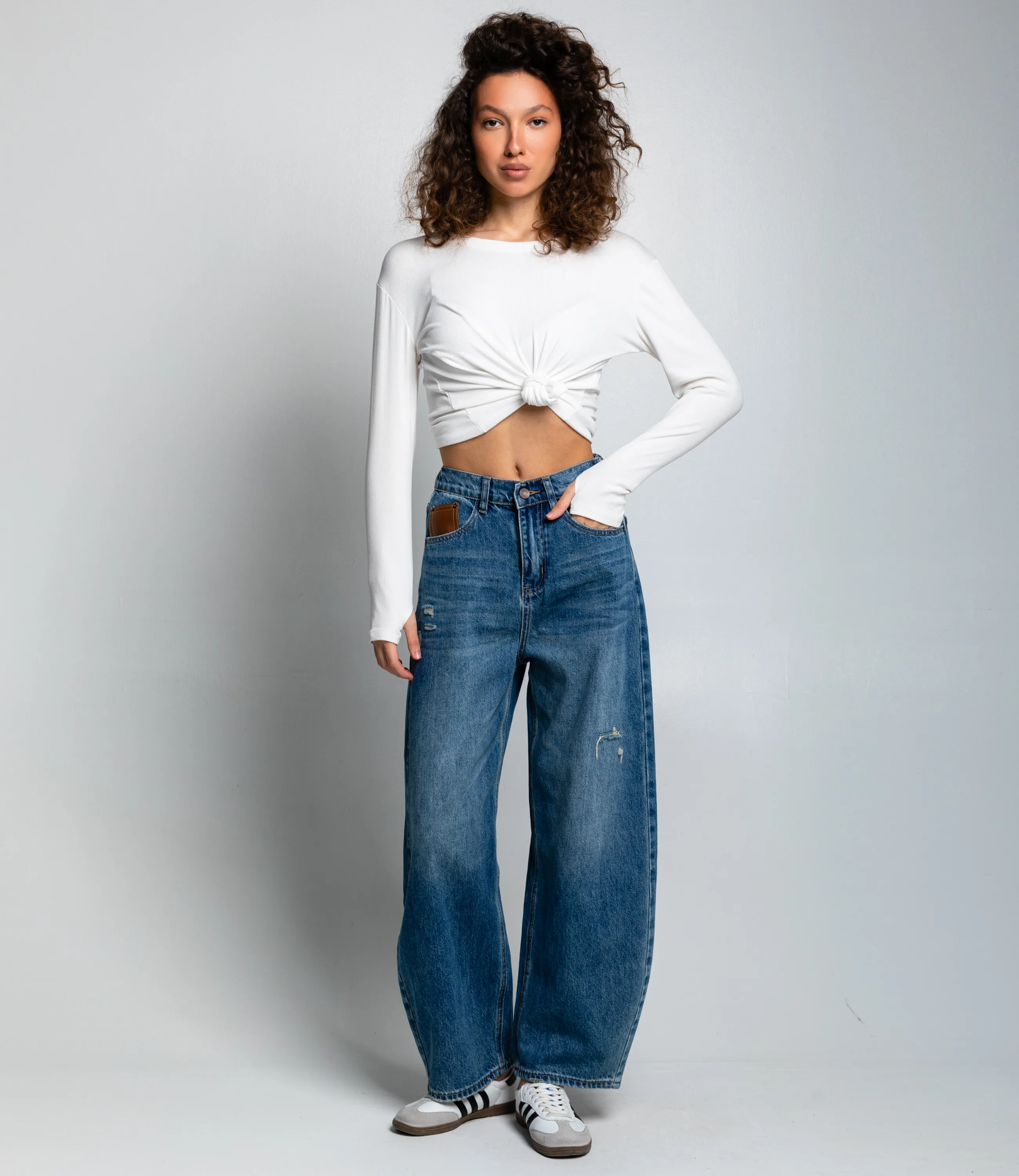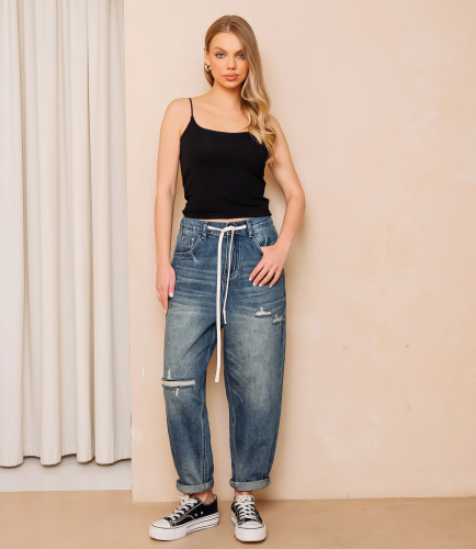 Джинсы — это часть гардероба, которая подчёркивает привлекательность каждой женщины. Широкие джинсы с завышенной талией и свободными прямыми штанинами до обуви; пояс с петлями, металлическая пуговица и молния; пять карманов (включая монетный); усиленные швы; небольшие декоративные потертости и прорехи на бедре и голени; плотный деним с видимой саржевой текстурой; двойная строчка по низу; свободный, повседневный силуэт. Для пошива использована ткань 90% хлопок, 5% полиэстер и 5% эластан. На странице представлена таблица размеров, которая поможет вам корректно сформировать ассортимент и минимизировать ошибки при оптовых закупках. Производитель обеспечивает качественную отделку и надёжную фурнитуру. Установленные оптовые условия адекватны и позволяют получить привлекательную маржинальность при продаже в магазинах. Рекомендуем включить эти джинсы в ассортимент оптовых закупок — они станут востребованным предложением для клиенток, ищущих комфортный и стильный повседневный предмет гардероба. Хлопок, Эластан, Полиэстер