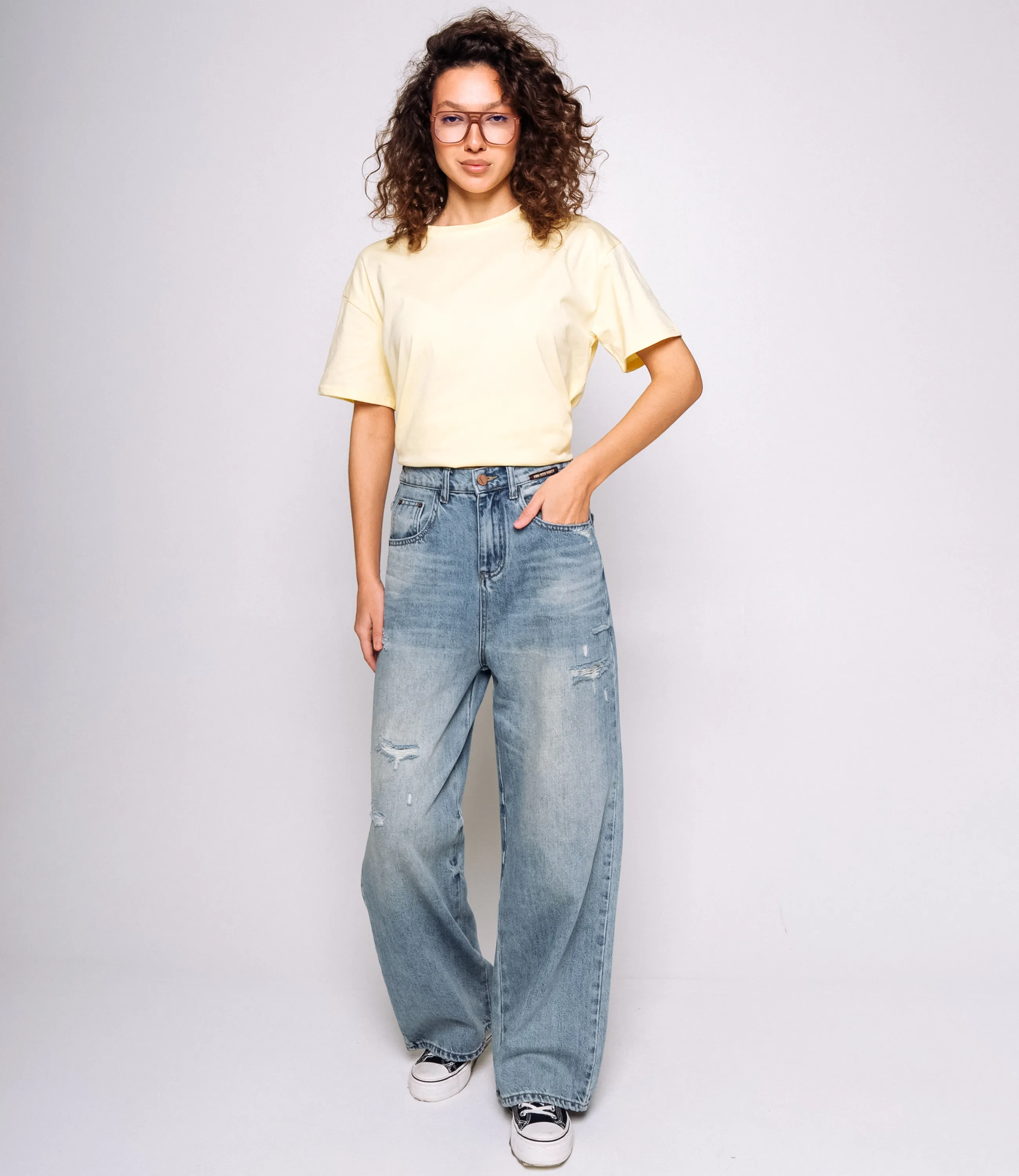 Джинсы — это часть гардероба, которая подчёркивает привлекательность каждой женщины. Свободные прямые джинсы с завышенной талией и классической длиной, выполненные из плотного денима с выраженной фактурой и равномерным эффектом выцветания, имеют стандартную пятикарманную конструкцию — два передних втачных кармана с мелким монетным кармашком и два задних прямоугольных кармана, пояс со шлевками для ремня, металлическую пуговицу и застёжку-молнию в гульфике; декоративные потертости и аккуратные прорези на бедре и колене с слегка осыпанными краями создают винтажный вид. Для пошива использована ткань 93% хлопок, 7% полиэстера. На странице представлена таблица размеров, которая поможет вам корректно сформировать ассортимент и минимизировать ошибки при оптовых закупках. Производитель обеспечивает качественную отделку и надёжную фурнитуру. Установленные оптовые условия адекватны и позволяют получить привлекательную маржинальность при продаже в магазинах. Рекомендуем включить эти джинсы в ассортимент оптовых закупок — они станут востребованным предложением для клиенток, ищущих комфортный и стильный повседневный предмет гардероба. Хлопок, Полиэстер
