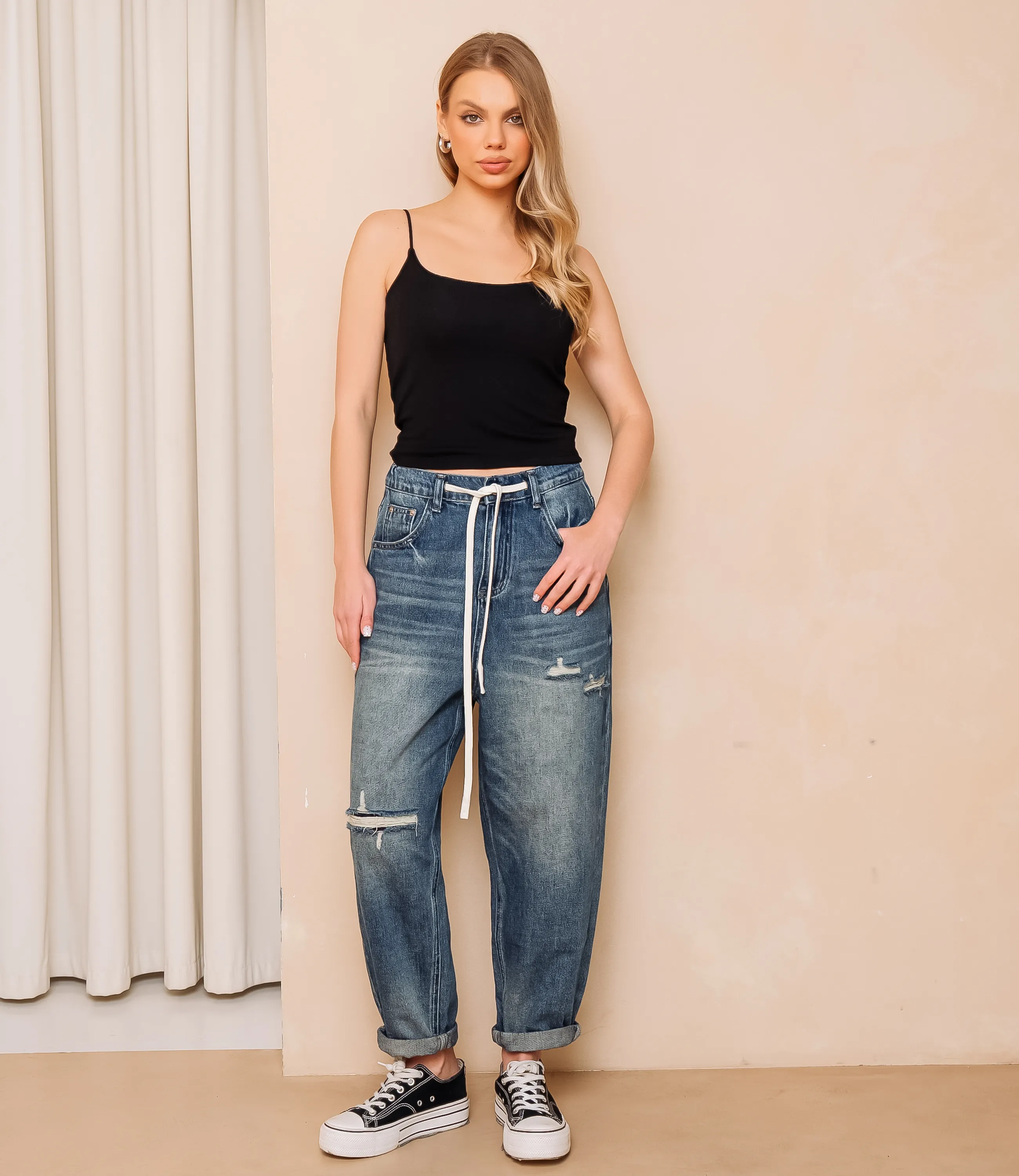 Джинсы — это часть гардероба, которая подчёркивает привлекательность каждой женщины. Джинсы с высокой посадкой и прямым, сильно расширяющимся книзу силуэтом. Джинсы с завышенной талией и свободным прямым кроем до щиколотки с подвернутыми манжетами; пятикарманный фасон с поясом, шлевками и шнурком вместо ремня; фронтальная застёжка на молнию и пуговицу; декоративные потертости и разрывы на бедрах и коленях с оголёнными нитями. Для пошива использована ткань 95% хлопок и 5% вискоза. На странице представлена таблица размеров, которая поможет вам корректно сформировать ассортимент и минимизировать ошибки при оптовых закупках. Производитель обеспечивает качественную отделку и надёжную фурнитуру. Установленные оптовые условия адекватны и позволяют получить привлекательную маржинальность при продаже в магазинах. Рекомендуем включить эти джинсы в ассортимент оптовых закупок — они станут востребованным предложением для клиенток, ищущих комфортный и стильный повседневный предмет гардероба. Рост модели 168 см., 89-63-90. Вискоза, Хлопок