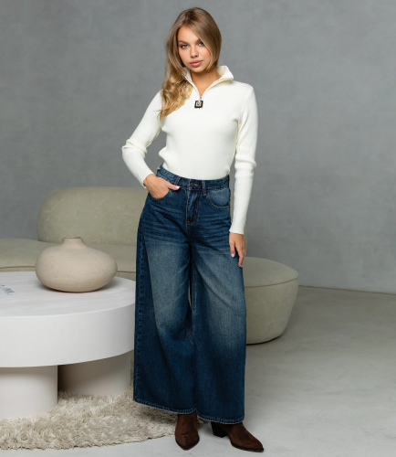 Джинсы — это часть гардероба, которая подчёркивает привлекательность каждой женщины.Модель с высокой талией и классической шириной бёдер плавно переходит в очень широкие, свободные штанины; посадка сидит выше линии талии, подчёркивая линию корпуса. Застёжка теснится на металлическую пуговицу и скрытую молнию, пояс снабжён петлями для ремня. Спереди расположены два скосных кармана и маленький монетный карман внутри правого, сзади — два накладных прямоугольных кармана с усиленной строчкой. Швы выполнены двойной прочной строчкой по бокам и шаговому шву для долговечности, декоративная прострочка подчёркивает контуры и конструктивные линии. Для пошива использована ткань 100% хлопок — натуральный и дышащий материал, приятный к телу и обладающий хорошей износостойкостью. При соблюдении рекомендаций по уходу изделие сохраняет внешний вид и посадку даже после многократных стирок, что важно для розничной продажи и довольных покупательниц. Цвет и фактура максимально соответствуют фотографии на сайте, что упрощает презентацию товара в магазине и снижает количество возвратов. На странице представлена таблица размеров, которая поможет вам корректно сформировать ассортимент и минимизировать ошибки при оптовых закупках. Производитель обеспечивает качественную отделку и надёжную фурнитуру. Установленные оптовые условия адекватны и позволяют получить привлекательную маржинальность при продаже в магазинах. Рекомендуем включить эти джинсы в ассортимент оптовых закупок — они станут востребованным предложением для клиенток, ищущих комфортный и стильный повседневный предмет гардероба. Хлопок