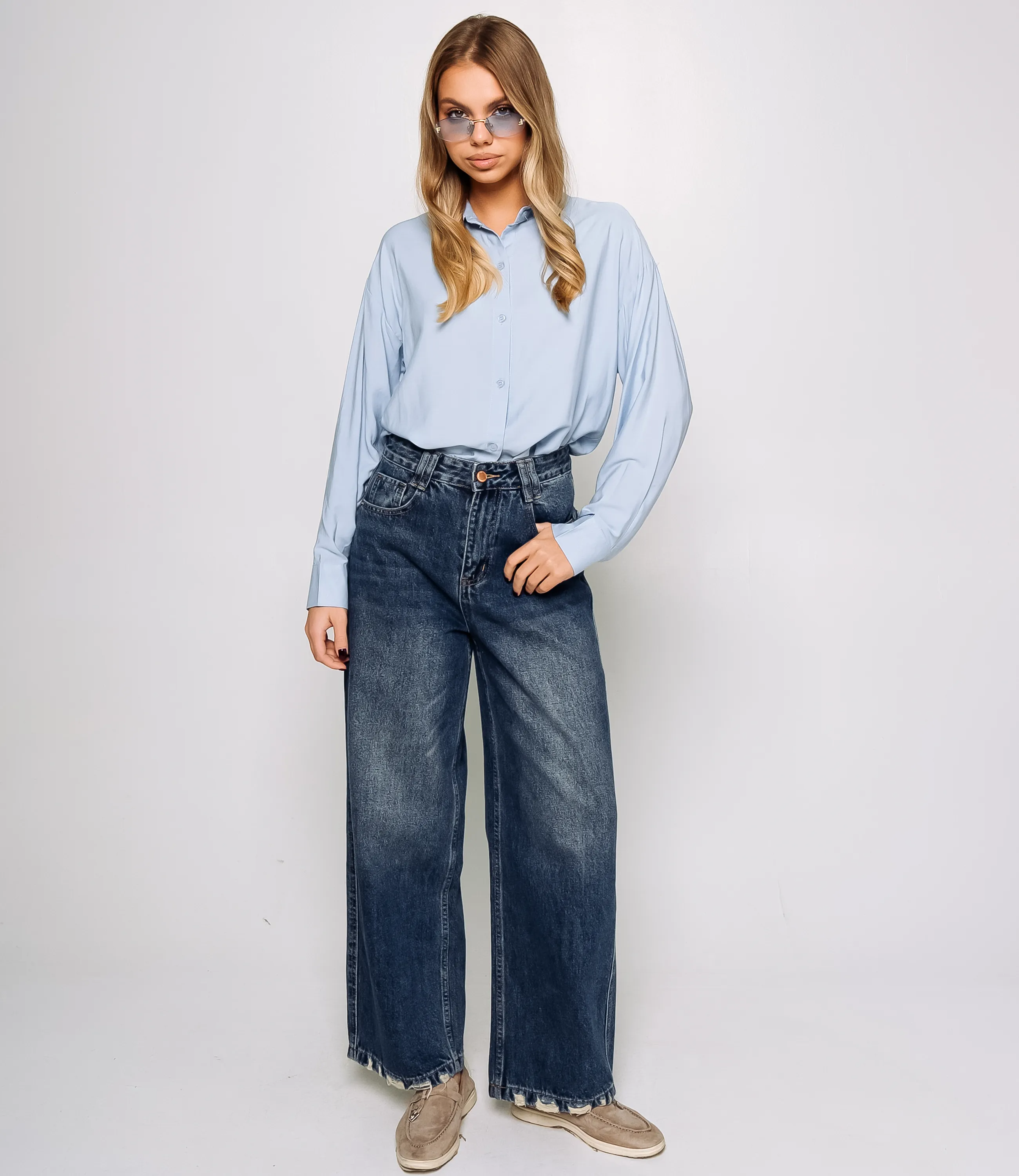 Джинсы — это часть гардероба, которая подчёркивает привлекательность каждой женщины. Модель выполнена в стиле с высокой посадкой и широкими штанинами, что обеспечивает комфорт и свободу движений. Необработанный низ с эффектом бахромы придаёт изделию модный и слегка небрежный вид. Классическая застёжка на молнию и пуговицу, а также стандартный набор карманов спереди и сзади обеспечивают практичность и удобство в носке. Плотный деним с лёгким эффектом потертости по всей длине создаёт винтажный характер и делает джинсы универсальным решением для повседневных casual‑образов. Для пошива использована ткань 100% хлопок — натуральный и дышащий материал, приятный к телу и обладающий хорошей износостойкостью. При соблюдении рекомендаций по уходу изделие сохраняет внешний вид и посадку даже после многократных стирок, что важно для розничной продажи и довольных покупательниц. Цвет и фактура максимально соответствуют фотографии на сайте, что упрощает презентацию товара в магазине и снижает количество возвратов. На странице представлена таблица размеров, которая поможет вам корректно сформировать ассортимент и минимизировать ошибки при оптовых закупках. Производитель обеспечивает качественную отделку и надёжную фурнитуру. Установленные оптовые условия адекватны и позволяют получить привлекательную маржинальность при продаже в магазинах. Рекомендуем включить эти джинсы в ассортимент оптовых закупок — они станут востребованным предложением для клиенток, ищущих комфортный и стильный повседневный предмет гардероба. Рост модели 168 см., 89-63-90.