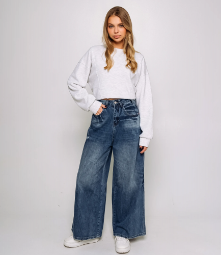 Джинсы — это часть гардероба, которая подчёркивает привлекательность каждой женщины. Джинсы свободного прямого кроя с высокой или средней посадкой, классическая пятикарманная конструкция с поясом на шлевках и застёжкой на пуговицу и молнию, линия бёдер не обтягивает, штанины идут ровно вниз, образуя лёгкую прямую силуэтную линию; передняя часть украшена декоративными горизонтальными швами и едва заметными следами лёгкой потертости и состаривания, задняя часть с традиционными накладными карманами с прострочкой, швы прокреплены контрастной строчкой, низ штанин завершён аккуратной подгибкой с усиленной прострочкой. Для пошива использована ткань 100% хлопок, отличающаяся прочностью и комфортом. Материал сохраняет форму и внешний вид даже после многократных стирок, что важно для розничной продажи и удовлетворённости покупательниц. Цвет и эффект потертости максимально соответствуют фотографии на сайте, что упрощает демонстрацию товара и снижает количество возвратов. На странице представленна таблица размеров, которая поможет вам корректно сформировать ассортимент и минимизировать ошибки при оптовых закупках. Производитель обеспечивает качественную отделку и фурнитуру, а установленные оптовые условия являются адекватными и обеспечивают хорошую маржинальность для магазинов. Рекомендуем включить эти джинсы в ассортимент оптовых закупок — они станут привлекательным предложением для клиенток, ищущих комфортную и стильную повседневную одежду. Хлопок