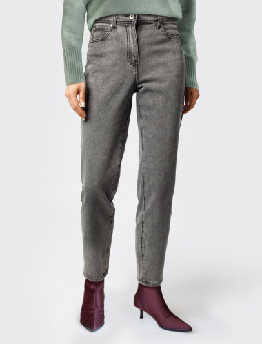 Джинсы mom-fit светло-серого цвета выполнены из эластичного денима. Лаконичная модель с легкой стиркой хорошо впишется в непринужденный повседневный образ с вещами и нейтральной, и яркой гаммы. Комфортная посадка на талии подходит для любой фигуры, ткань хорошо тянется и не сковывает движений. Изделие дополнено классической задней нашивкой из бежевой эко-кожи с логотипом бренда. светло-серый