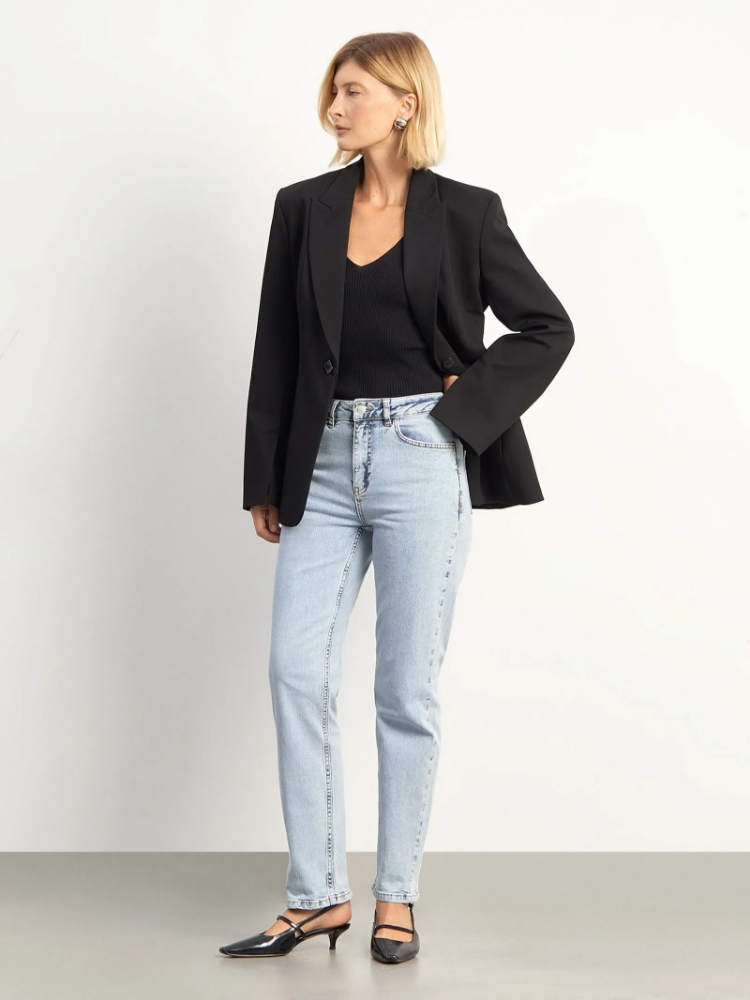 Джинсы из натурального хлопка c добавлением эластана в голубом цвете. Укороченная модель прямого кроя имеет более высокую посадку по спинке. Универсальные джинсы станут основой повседневных образов с трикотажем и другими вариантами верха