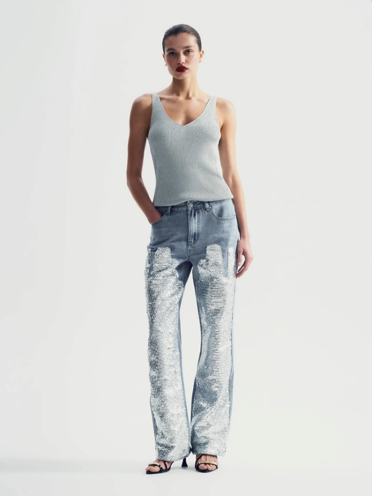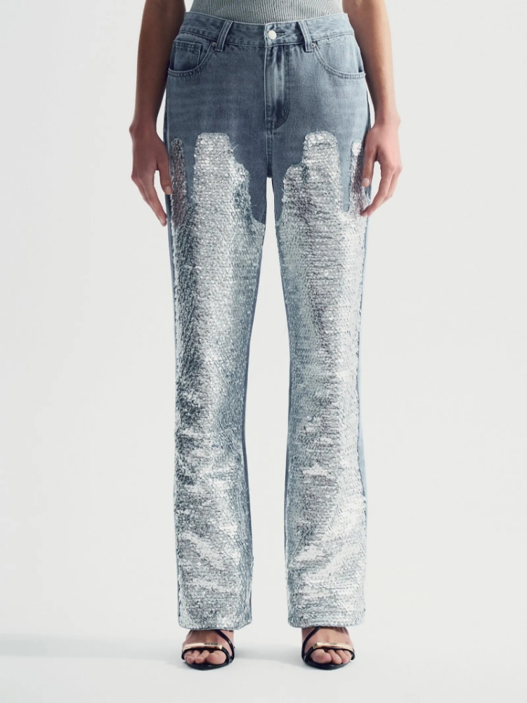 Самые модные джинсы сезона — актуальный выбор для выходных, вечеринок и выходов с друзьями. Расшитые серебристыми пайетками светлые джинсы составляют идеальный тандем с простой белой рубашкой, легко комбинируются с трикотажем любых оттенков и фасонов. Интересной парой к ним будут топы с люрексом.Прямая модель полной длины визуально корректирует силуэт, ноги выглядят ещё ровнее и длиннее. Имеет среднюю посадку