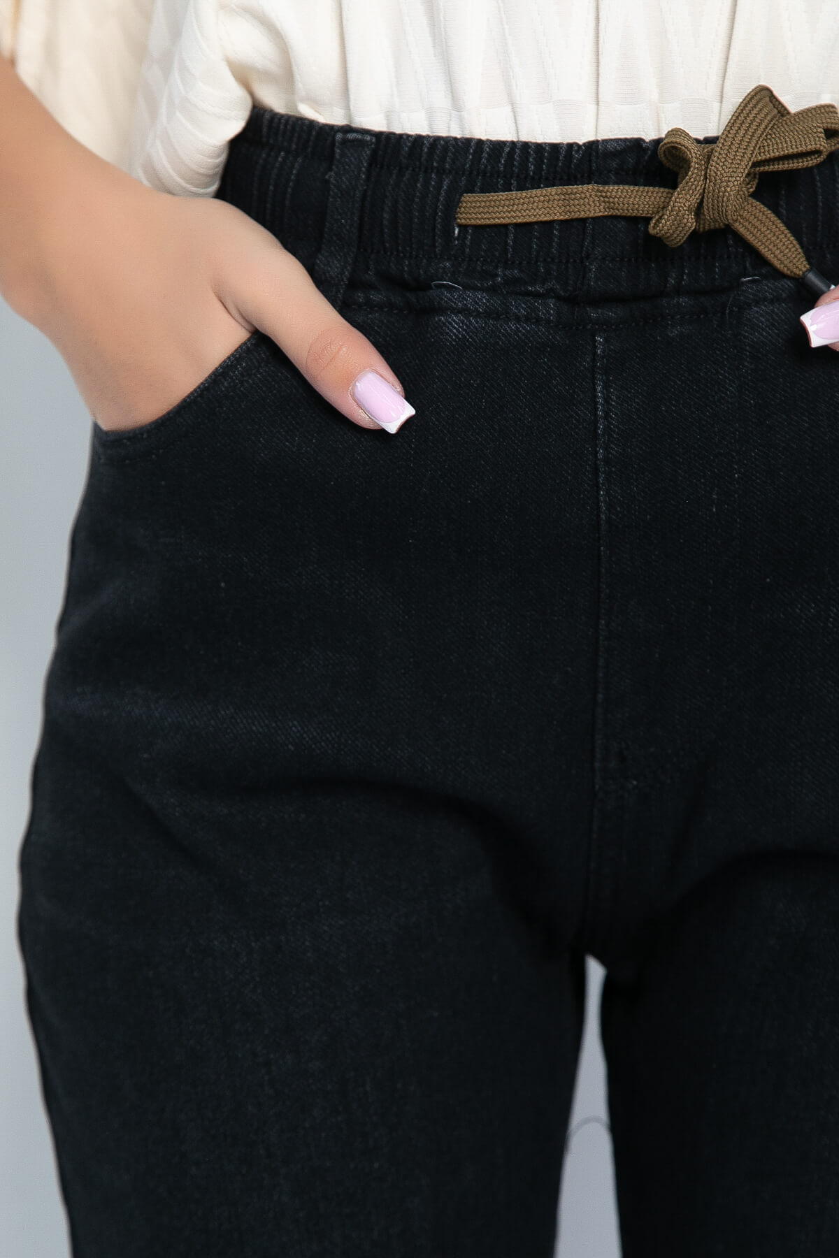 Идеальные джинсы для стильного образа. Ключевая особенность заключается в их крое, они заужены к низу, подчеркивая стройные ноги и придавая визуальную легкость вашему образу, Дополнены широкой резинкой в поясе, что обеспечивает универсальную посадку. Кроме того, пояс-шнурок является дополнительным элементом декора. Благодаря прямой, слегка зауженной форме штанины идеально подойдут для женщин и девочек с разными типами фигур. Есть начёс.