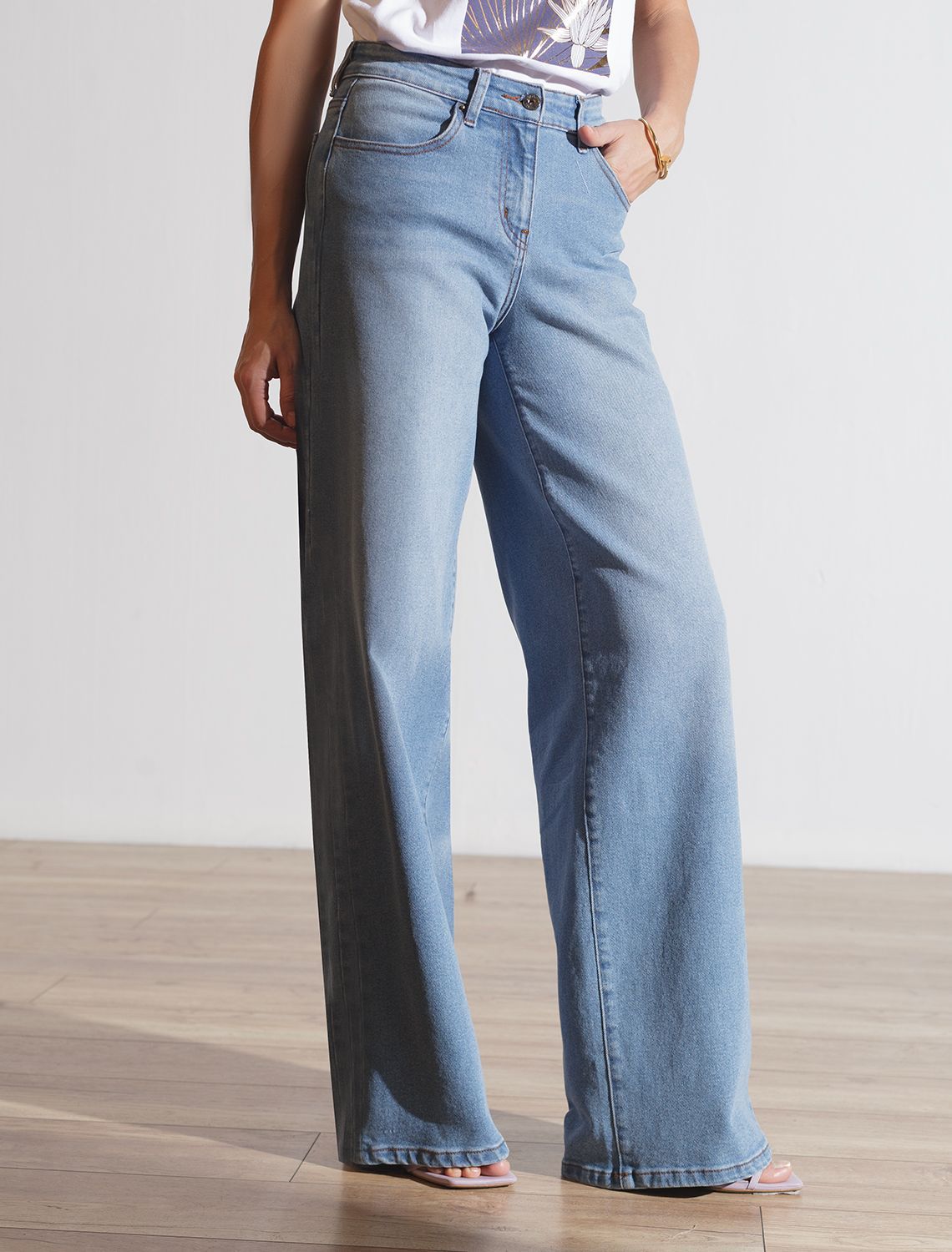 Стильные джинсы трубы голубого цвета прямого кроя выполнены из эластичного денима плотностью 12,4 OZ. После пошива изделие подвергли специальному виду вошинга — salt-stone washing (солт-стоун вошинг), что дословно значит стирка с каменной солью. Такой вид вошинга позволяет получить стильные потертости на голубых оттенках денима. Джинсы правильного кроя визуально вытягивают силуэт, благодаря эластану в составе аккуратно садятся на любую фигуру, подчеркивая достоинства и обеспечивают максимальный комфорт в течение дня, не сковывая движения. Широкая размерная линейка подходит для разных типов фигур: свободные джинсы комфортны как для обладательниц пышных форм, так и для худеньких. Джинсы идеально держат форму даже при активном движении и не вытягиваются, что делает их особенно удобными для повседневной носки. Качественная надежная фурнитура делает эти джинсы премиальными.