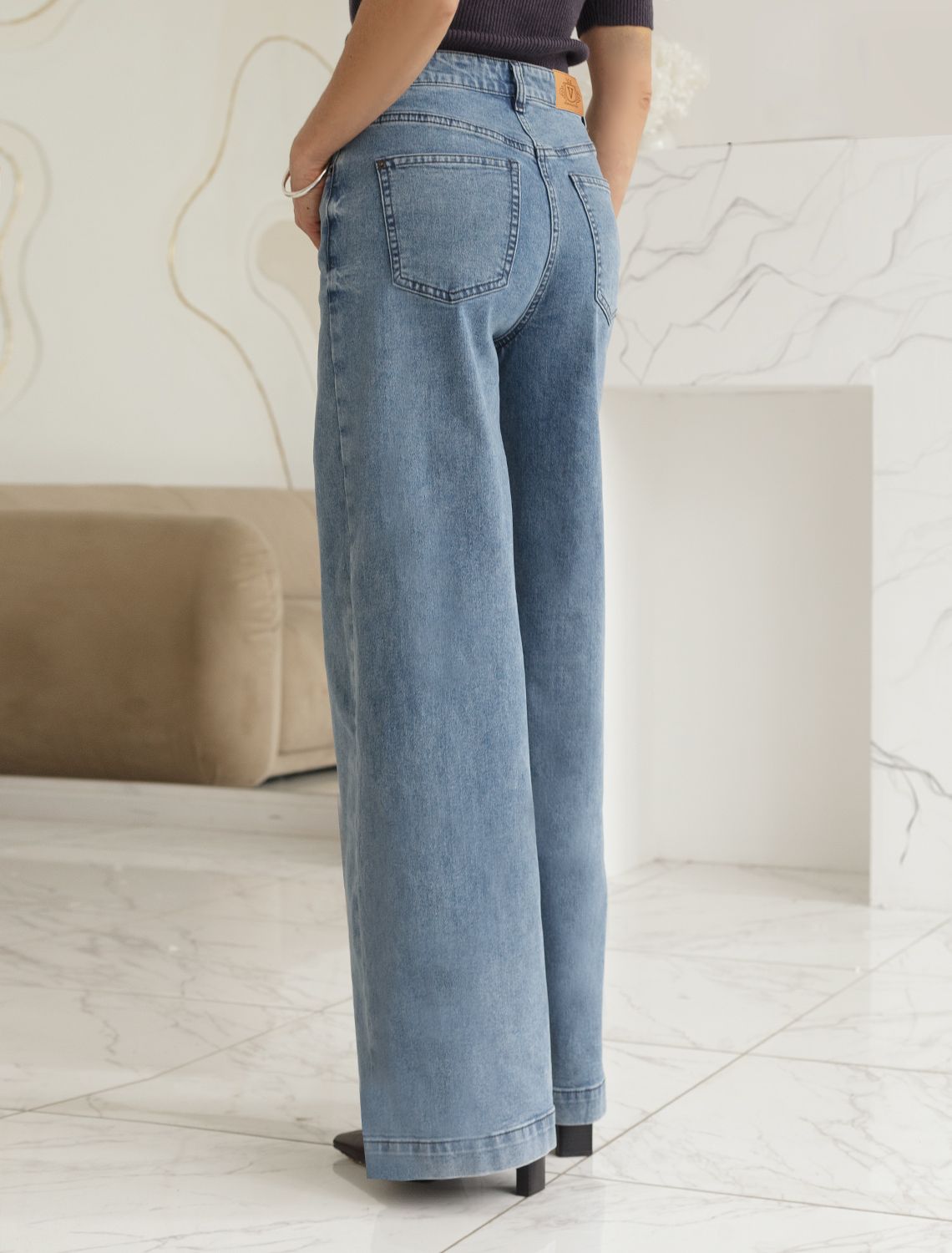 Стильные джинсы трубы синего цвета прямого кроя выполнены из эластичного денима плотностью 12 OZ, что делает их особенно удобными для повседневной носки. Декоративная стирка добавляет современный акцент и подчеркивает современный дизайн. Джинсы правильного кроя визуально вытягивают силуэт, благодаря эластану в составе аккуратно садятся на любую фигуру, подчеркивая достоинства, а обеспечивают максимальный комфорт в течение дня, не сковывая движения. Широкая размерная линейка подходит для разных типов фигур: свободные джинсы комфортны как для обладательниц пышных форм, так и для худеньких. Плотные джинсы идеально держат форму даже при активном движении и не вытягиваются после долгой носки. Качественная фурнитура, практичные карманы и контрастная строчка делают эти джинсы премиальными. Широкий подгиб добавляет актуальности — такой тренд отлично сочетается как с обувью на каблуке, так и на плоском ходу. Благодаря универсальному дизайну джинсы легко комбинируется с разными элементами гардероба: свитерами для прохладной осени или легкими блузками в межсезонье.