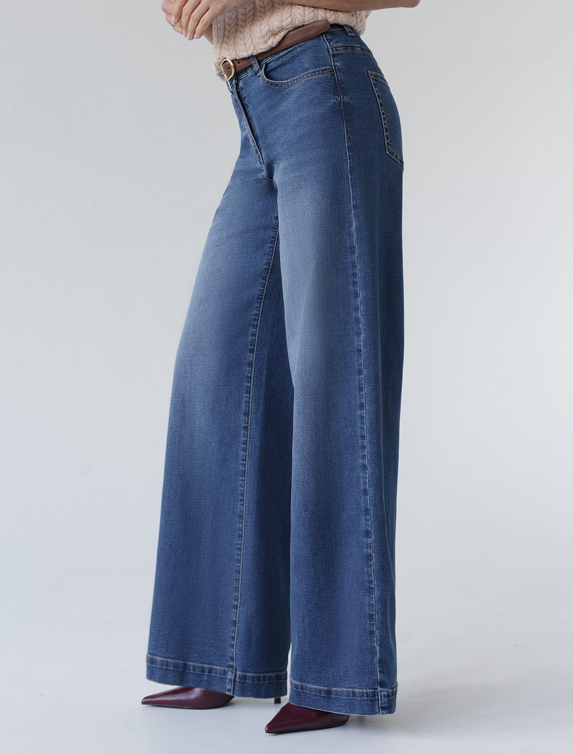 Стильные джинсы трубы синего цвета прямого кроя выполнены из эластичного денима, что делает их особенно удобными для повседневной носки. Декоративная стирка подчеркивает современный дизайн. Джинсы правильного кроя визуально вытягивают силуэт, благодаря эластану в составе аккуратно садятся на любую фигуру, подчеркивая достоинства и обеспечивают максимальный комфорт в течение дня, не сковывая движения. Широкая размерная линейка подходит для разных типов фигур: свободные джинсы комфортны как для обладательниц пышных форм, так и для худеньких. Вы сможете подабрать джинсы на низкий или высокий рост. Плотные джинсы идеально держат форму даже при активном движении и не вытягиваются после долгой носки. Качественная фурнитура, практичные карманы и контрастная строчка делают эти джинсы премиальными. Широкий подгиб добавляет актуальности — такой тренд отлично сочетается как с обувью на каблуке, так и на плоском ходу. Благодаря универсальному дизайну джинсы легко комбинируется с разными элементами гардероба.
