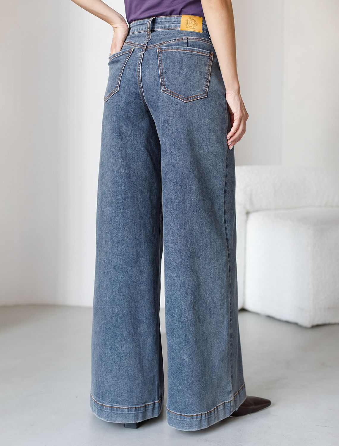 Стильные расклешенные джинсы трубы благородного серо-синего цвета из эластичного денима созданы для современного образа и максимального комфорта. Плотный премиальный материал обеспечивает надежность и приятные ощущения при носке, а добавление эластичных волокон делает посадку особенно удобной. Высокая посадка и расширенный крой к низу визуально вытягивает рост и подчеркивает достоинства, делая силуэт женственным, а декоративная стирка добавляет акцент. Эти широкие джинсы - оличное решение для девушек размера полюс сайз. Детали продуманы до мелочей: мягкий пояс не сдавливает живот, задние карманы и шов расположены на правильном уровне, что бы визуально подтянуть фигуру, а натуральный материал сохраняет форму после длительной носки и частых стирок.
