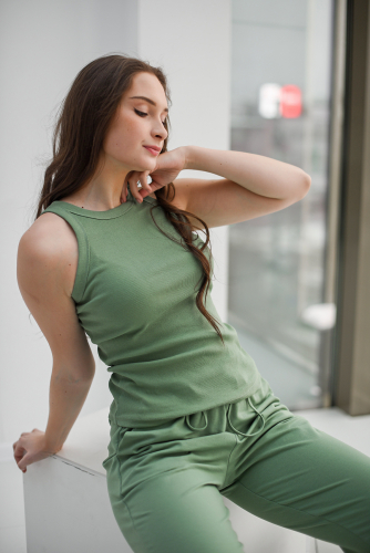 Круглая горловина и линии пройм обработаны широкой окантовкой. Майка отличается мягкостью, удобством, комфортом и практичностью. В летний зной позволяет телу дышать, зимой – согревает и дарит тепло. Отлично впишется, как в спортивный гардероб её обладательницы, так и классический, в сочетании с жакетом или кардиганом.