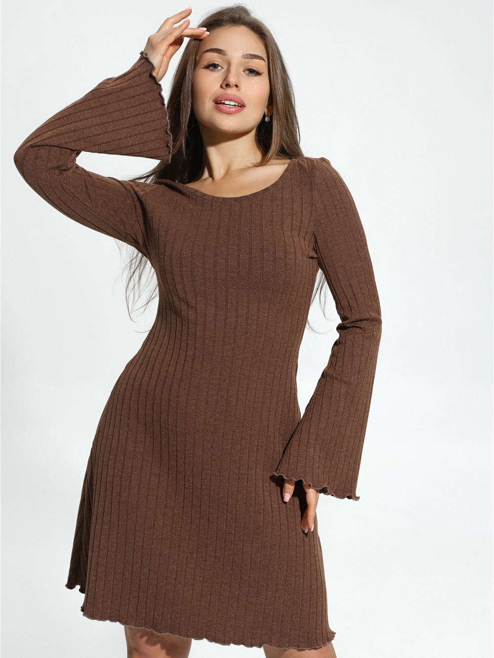 Платье из лапши с широким рубчиком, приталенное с длинным, втачным, расклешенным к низу рукавом.
