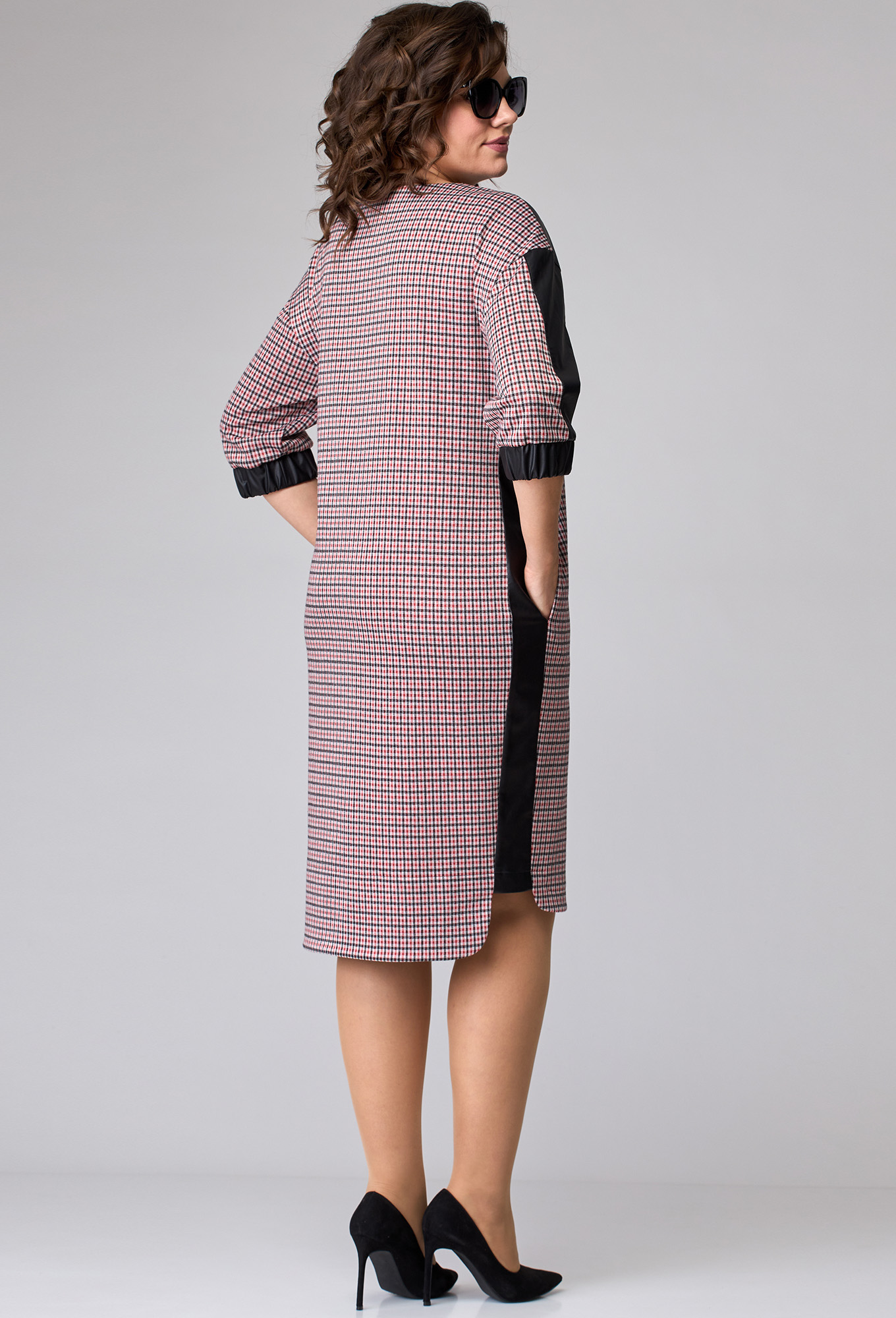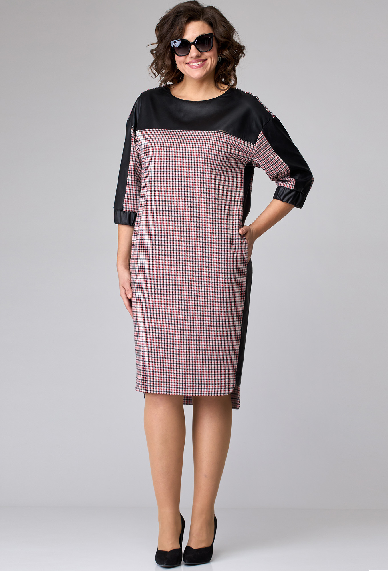 Платье женское повседневное полуприлегающего силуэта, выполнено из трикотажного полотна в сочетании с искусственной кожей (экокожа). Вырез горловины круглый обработан обтачкой, плечо спущенное, рукав втачной 3/4 по низу на притачной манжете (манжета на резинке). В боковых швах обработаны карманы, низ фигурный(по спинке чуть длиннее). Декором служат вставки из экокожи по полочке и рукавам.