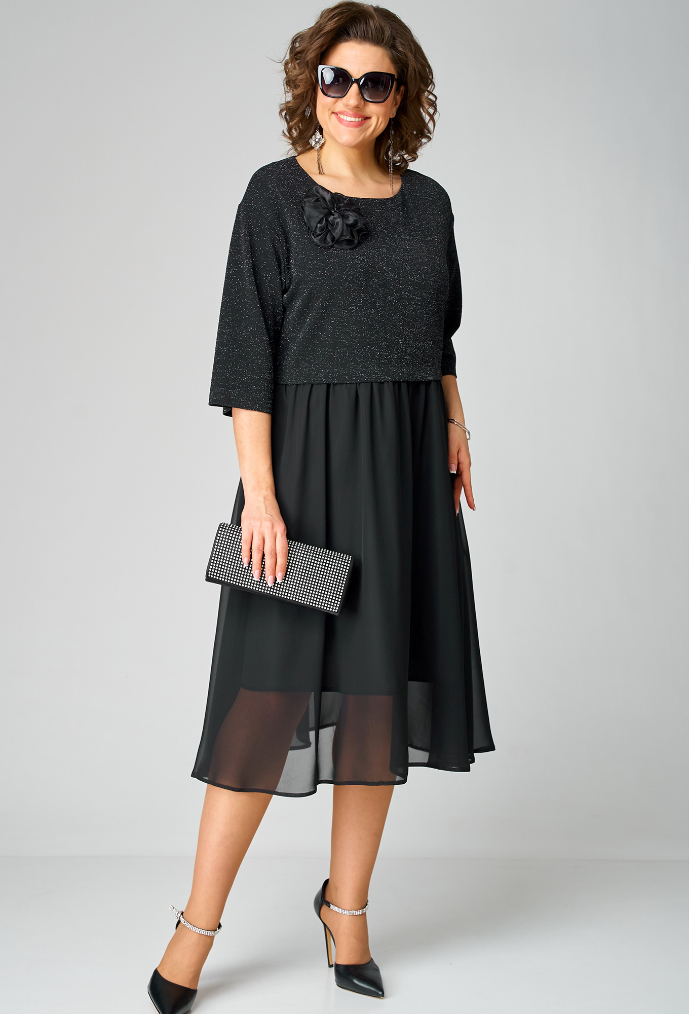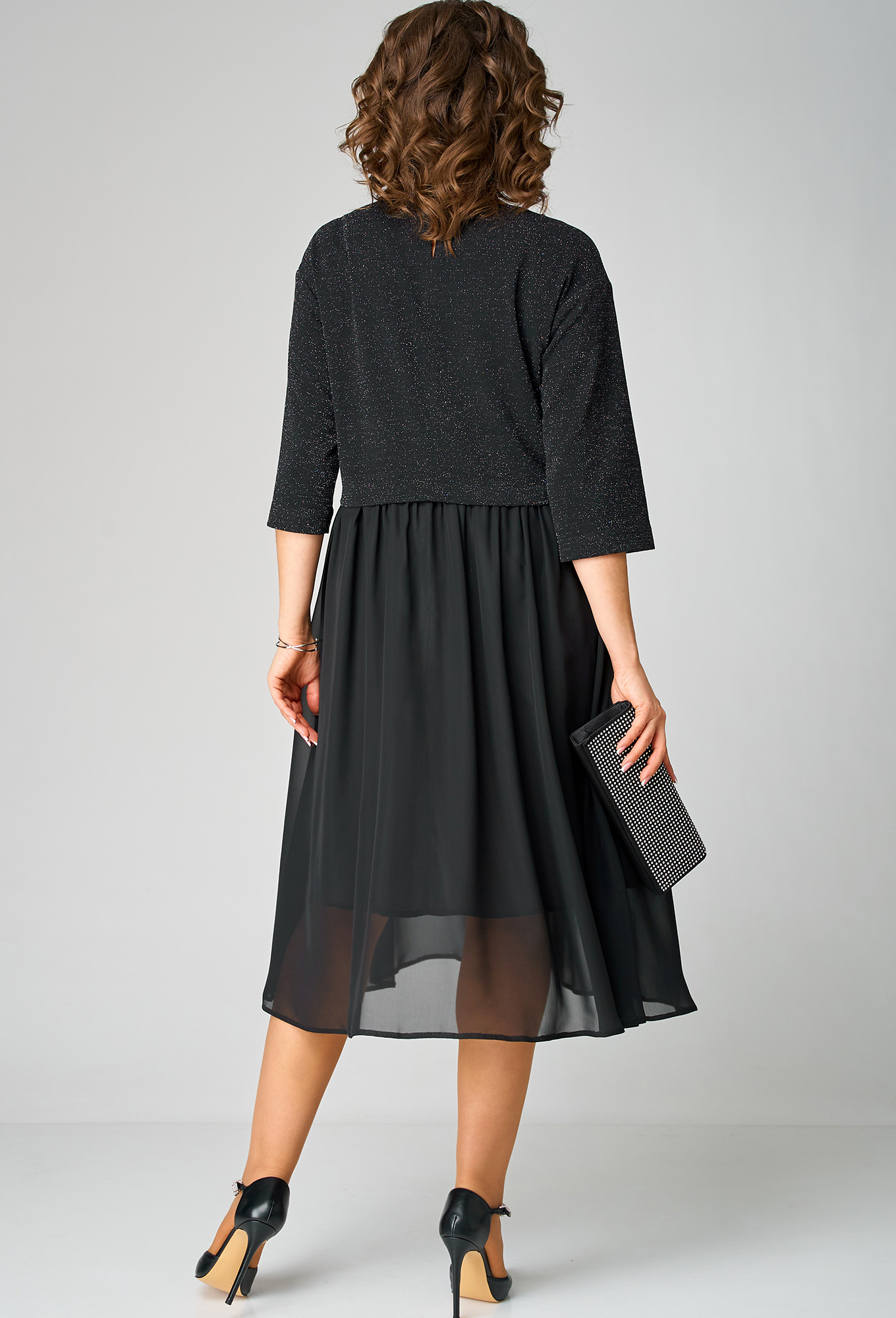Платье женское нарядное полуприлегающего силуэта до талии, расширенное к низу отрезное по талии. Выполнено из трикотажного полотна в сочетании с шифоном. Вырез горловины круглый обработан обтачкой, по спинке застежка на навесную петлю и пуговицу. Рукав втачной 3/4. Юбка из шифона на подкладке, по талии собрана на сборку. Декором служит съемный цветок.