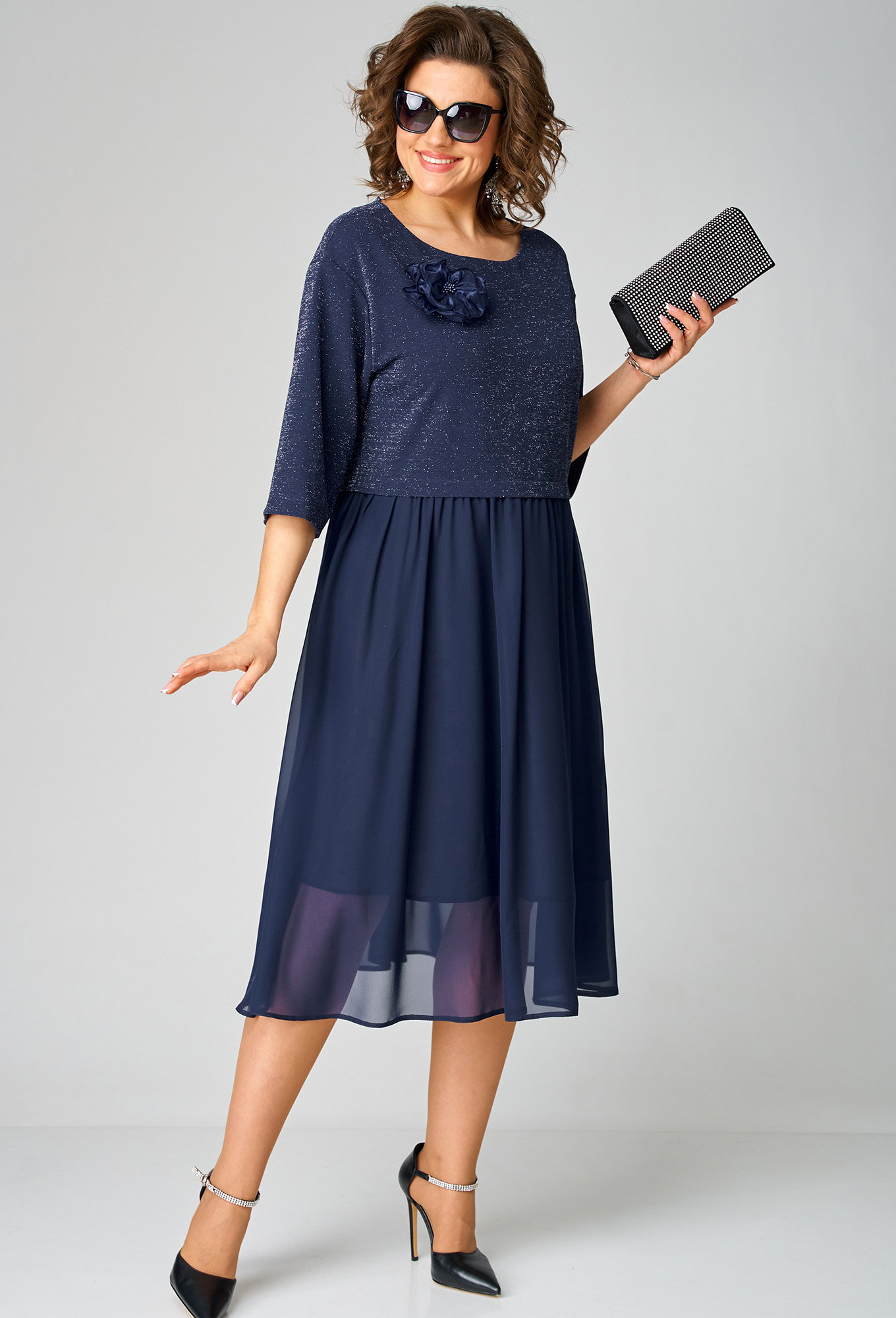 Платье женское нарядное полуприлегающего силуэта до талии, расширенное к низу отрезное по талии. Выполнено из трикотажного полотна в сочетании с шифоном. Вырез горловины круглый обработан обтачкой, по спинке застежка на навесную петлю и пуговицу. Рукав втачной 3/4. Юбка из шифона на подкладке, по талии собрана на сборку. Декором служит съемный цветок.
