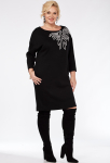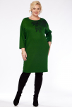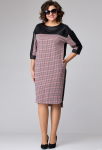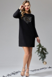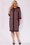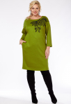 Платье женское нарядно-повседневное прилегающего силуэта, выполнено из трикотажного полотна в сочетании с отделкой. Вырез горловины отложной воротник. По центру переда втачная планка из отделочной ткани, нагрудные выточки и накладные карманы. Рукав втачной, по центру с отделкой.спинка с центральным швом и небольшим разрезом обработанным отделочной тканью. Декором служат детали из отделочной ткани и нашивка на воротнике.
