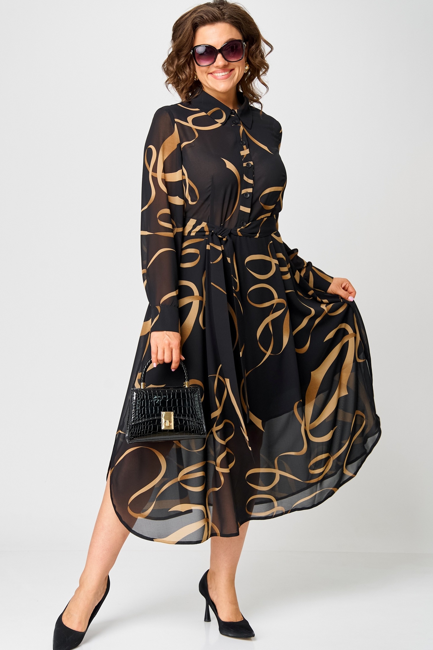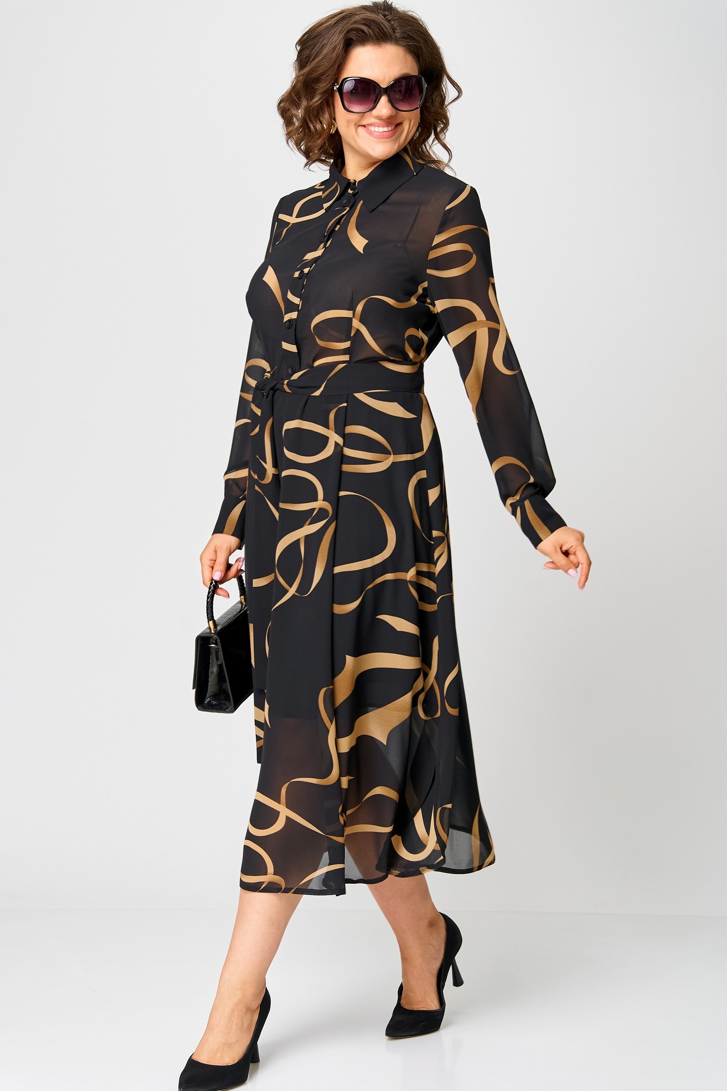 Платье женско нарядно-поседневное полуприлегающего силуэта до талии расширенное к низу. Платье отрезное по талии, выполнено из креп-шифона, врез горловины воротник на стойке рубашечного типа, рукав втачной по низу на притачной манжете. Низ платья фигурный, в боковых швах обработаны разрезы. По юбке платья от талии трикотажная подкладка. Декором платья служит съемный пояс и принт самой ткани.