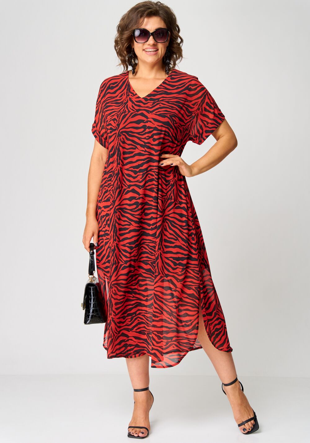 Платье женское нарядно-поседневное полуприлегающего силуэта расширенное к низу на подкладке. Выполено из шифона. Подкладка трикотажная. Вырез горловины V-образный на обтачке, рукав спущенный по низу на притачной манжете. Низ фигурный. В боковых швах обработаны разрезы. Горловина спинки с фигурным вырезом и пряжкой. декором платья служит дизайн самой ткани.