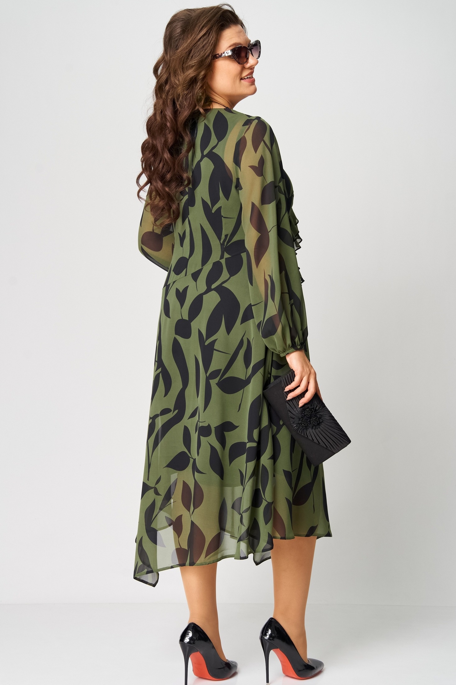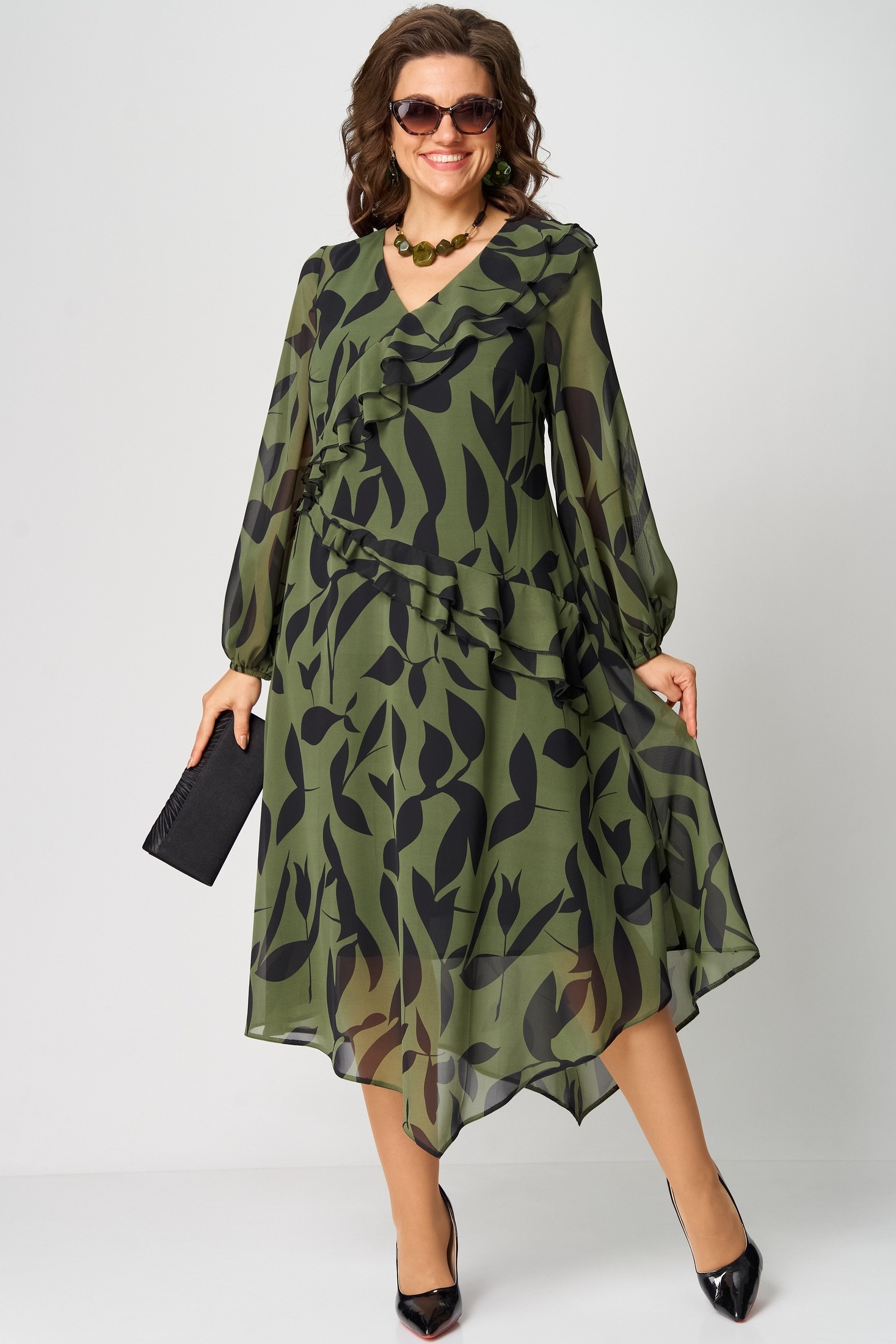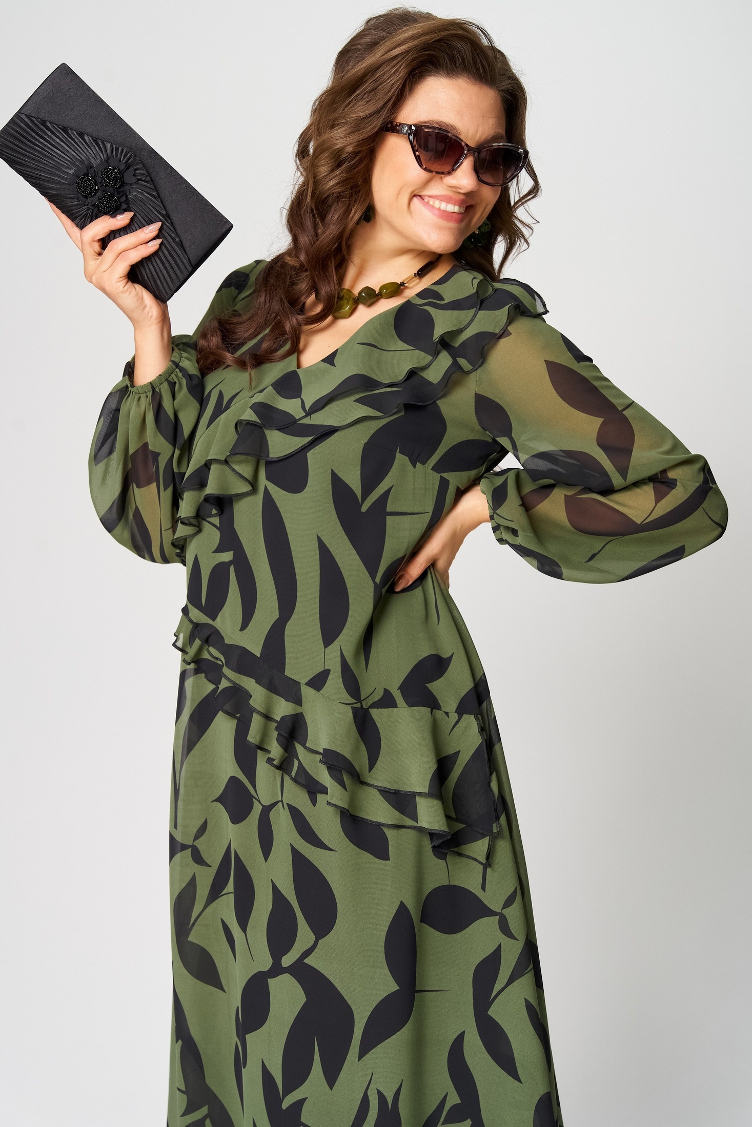 Платье женское нарядное полуприлегающего силуэта на трикотажной подкладке расширенное к низу выполнено из шифона. Вырез горловины V-образный, рукав втачной по низу собран на резинку. По полочке нагрудные вытачки и фигурные подрезы с двойными воланами. Низ платья фигурный. Декоро платья служат воланы и дизайн самой ткани.