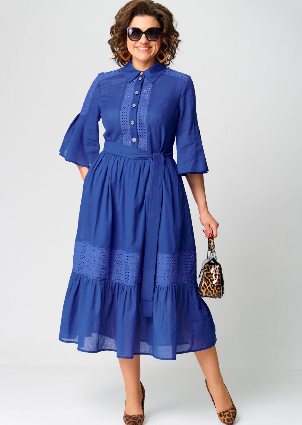 Платье женское нарядно-повседневное полуприлегающего силуэта до талии расширенное к низу. Выполнено из хлопка в сочетании с отделкой из хлопокового шитья. Вырез горловины воротик на стойке рубашечного типа, рукав втачной с отделочными вставками из шитья. расширенный к низу за счет встречных складок. По талии и по нижнему волану юбки сборка и отделочная вставка из шитья. По верхней части спинки фигурная кокетка из шитья. Застежка до талии на обметанные петли и пуговицы. Декором платья служит съемнй пояс из основной ткани.
