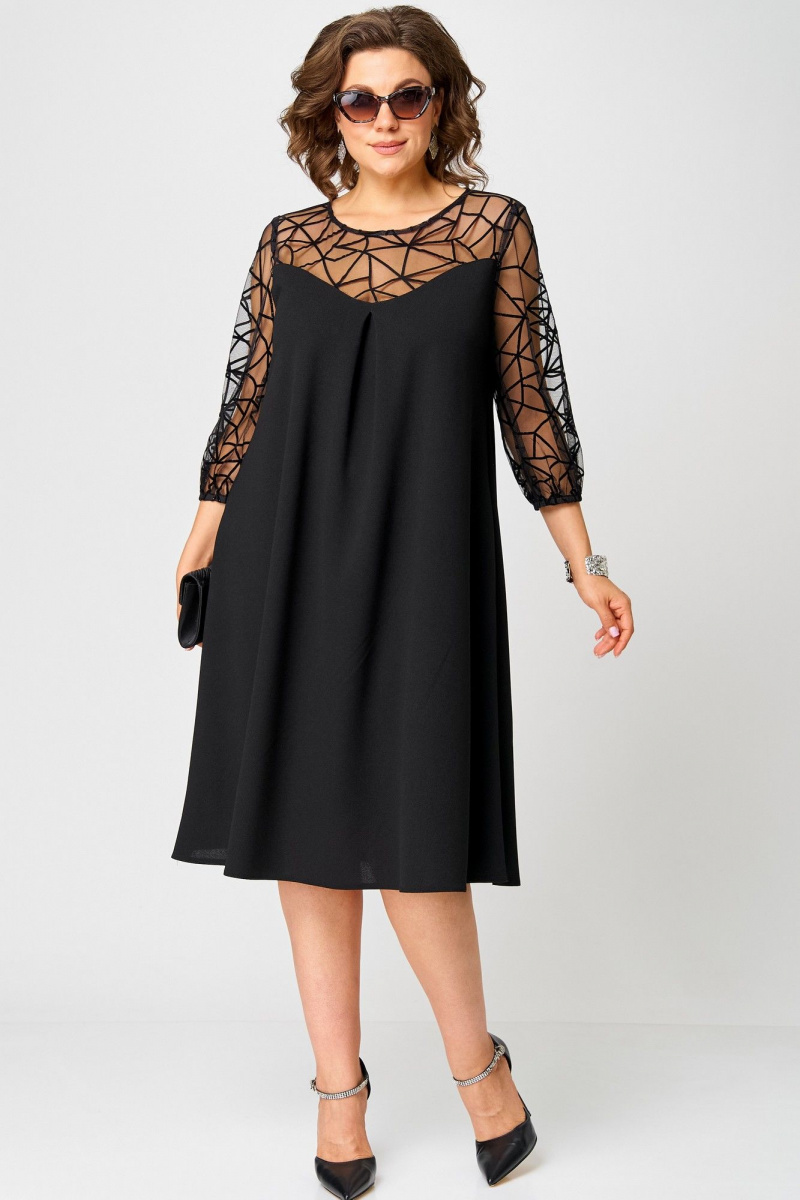 Платье женское нарядное А-силуэта выполнено из плательного крепа в сочетании с отделкой. Вырез горловины круглый обработан косой бейкой. Рукав втачной 7/8по низу на притпной резинке. В боковых швах обработаны карманы. По переду платья фигурная кокетка из отделочной ткани. По центру платья под кокеткой встречная складка. Декором служит дизайн отделочной ткани.