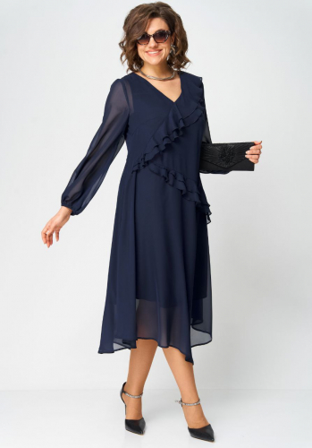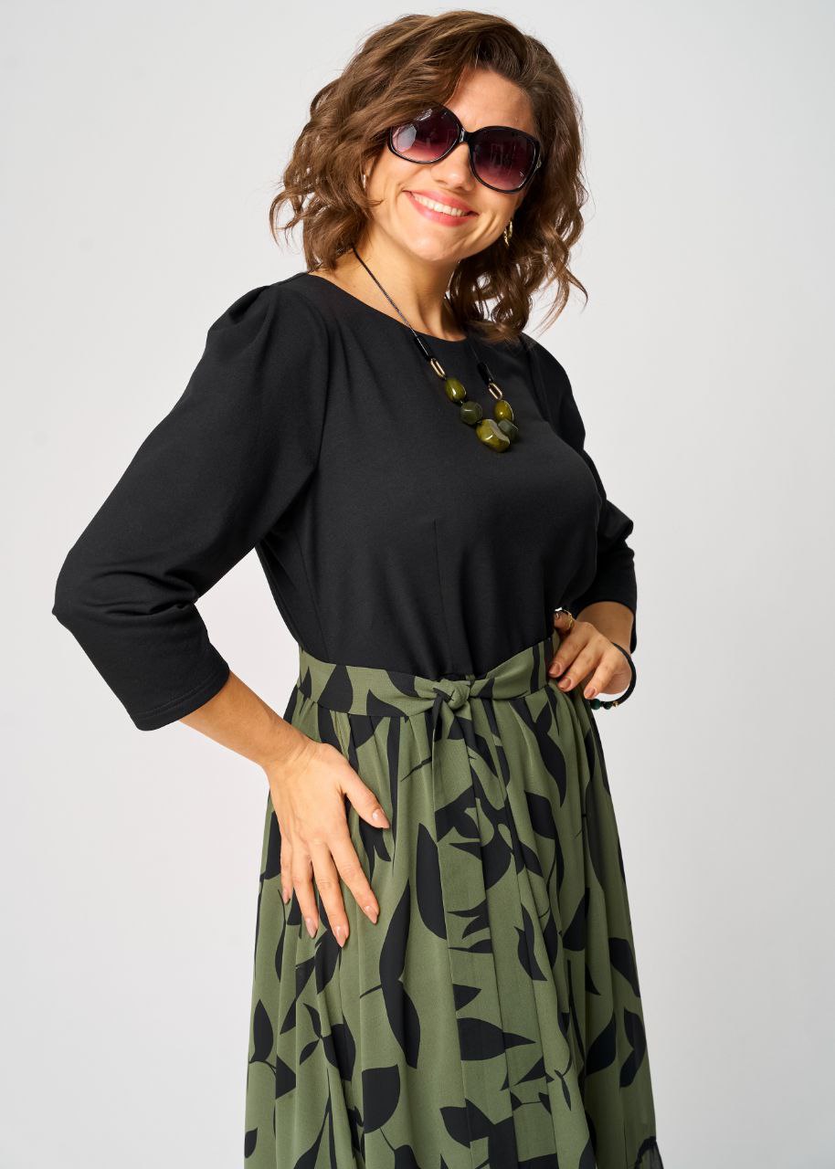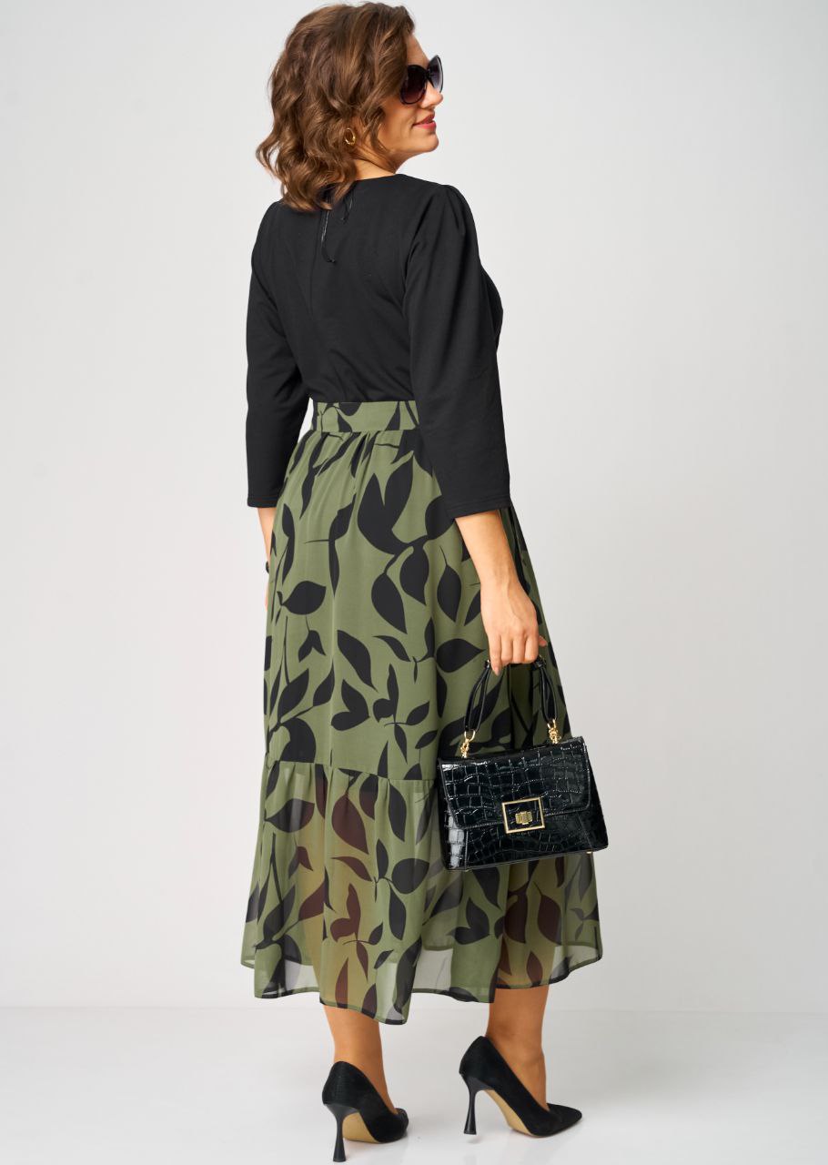 Платье женское нарядно-повседневное полуприлегающего силэта до талии. Выполненео из трикотажного полотна в сочетании с шифоном. Вырез горловины круглый на обтачке. По спинке застежка капелька на навесную петлю и пуговицу. Рукав втачной 7/8 по верху со встречной складкой. Платье отрезное по талии, верх из трикотажного полотна , низ платья юбка со сборкой. декором платья служит съемный пояс в цвет юбки.