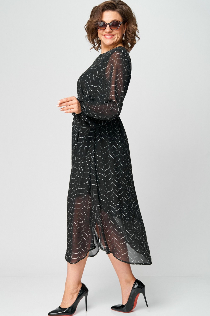 Платье женское нарядно-повседневное А-образного силуэта, выполненео из креп-шифона. Платье на трикотажной подкладке. Вырез горловины круглый на обтаке, по спинке астежка на навесную петлю и пуговицу. Рукав втачной по низу собран на резинку. В бокох швах обработаны разрезы, низ платья фигурый.Декором платья служит принт самой ткани. Пояс в комплекте.