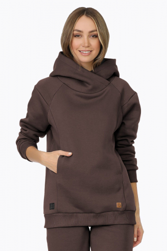 Худи свободного кроя, немного удлиненно, со спущенной линией плеча. Объемный капюшон со шнурами в дуэте с высоким воротом - идеальный вариант против ветра, холода и непогоды. Декорировано оригинальными боковыми швами с функциональными карманами. Манжет и низ изделия выполнены из качественного эластичного материала в рубчик.