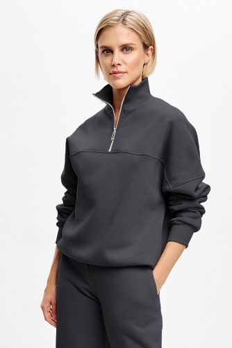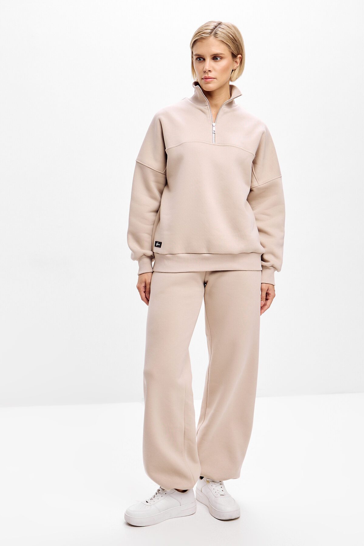 Худи свободного кроя, со спущенной линией плеча. Манжет и низ изделия выполнен из качественного эластичного материала в рубчик, декорирован брендированным шевроном. Ворот на короткой металлической молнии, акцентирован декоративным швом. Зауженная резинка по низу создает силуэт "бочонка".