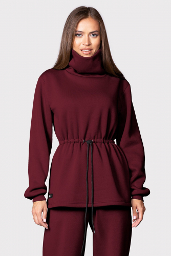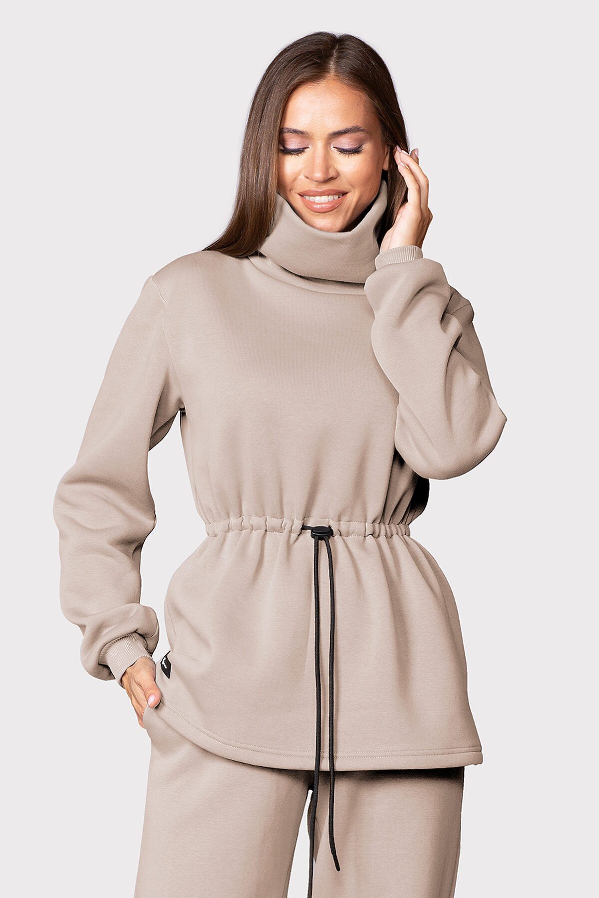 Удлиненный свитшот с объемным воротом и длинным рукавом на манжете. Приталивается и подчеркивает талию засчет кулиски на текстильных завязках с утяжкой. Декорирован именным шевроном с логотипом Ezanna.