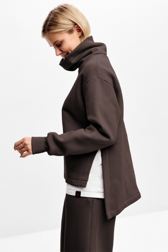 Модель оверсайз, со спущенной линией плеча. Контрастная белая горловина оригинальной формы и дублирующая белая полоска по низу. Горловина, манжеты и низ изделия выполнены из качественного эластичного материала в рубчик.