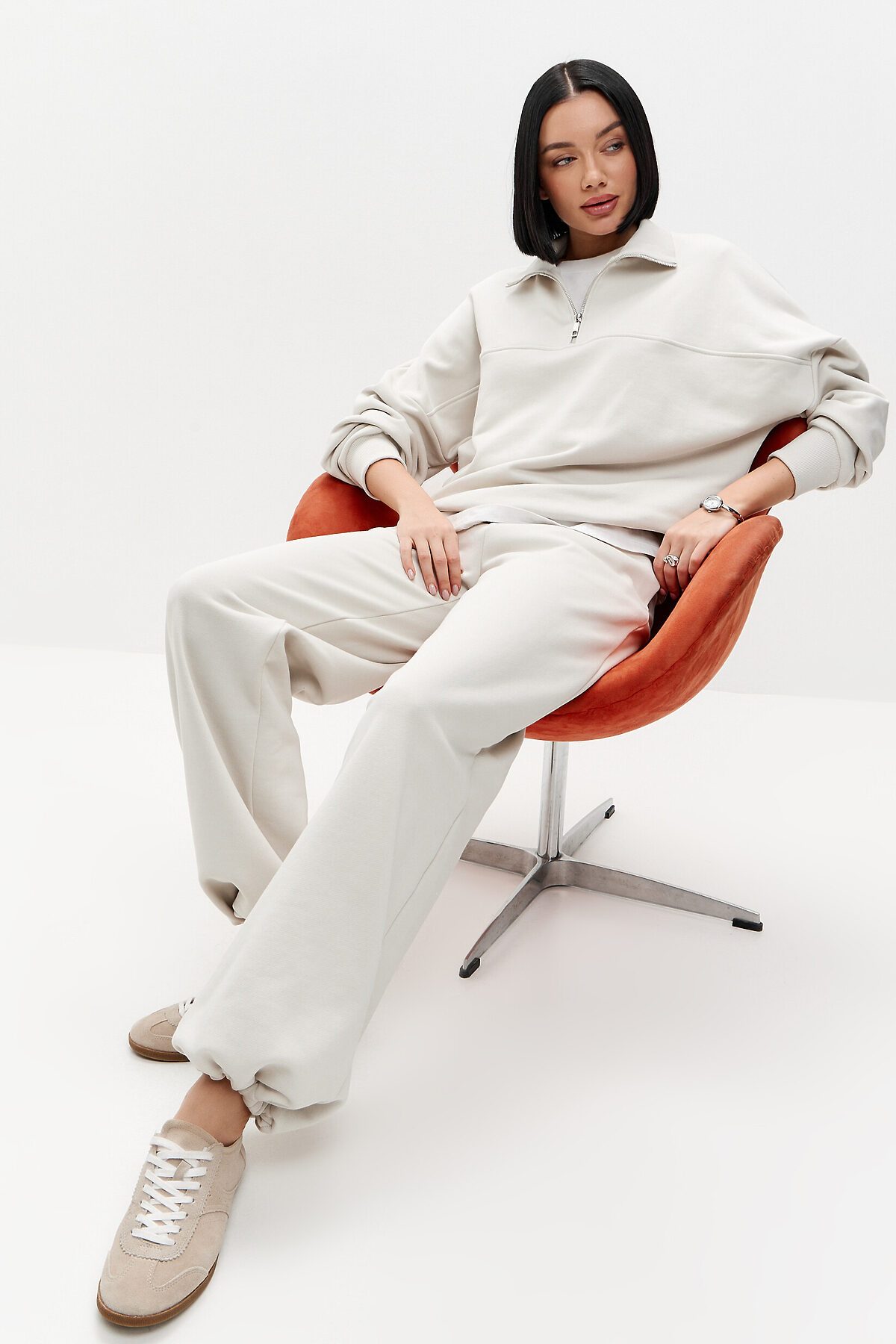 Толстовка на разъемной молнии. Ворот стойка и манжеты выполнены из основной ткани. Низ изделия на резинке с тройной отстрочкой.