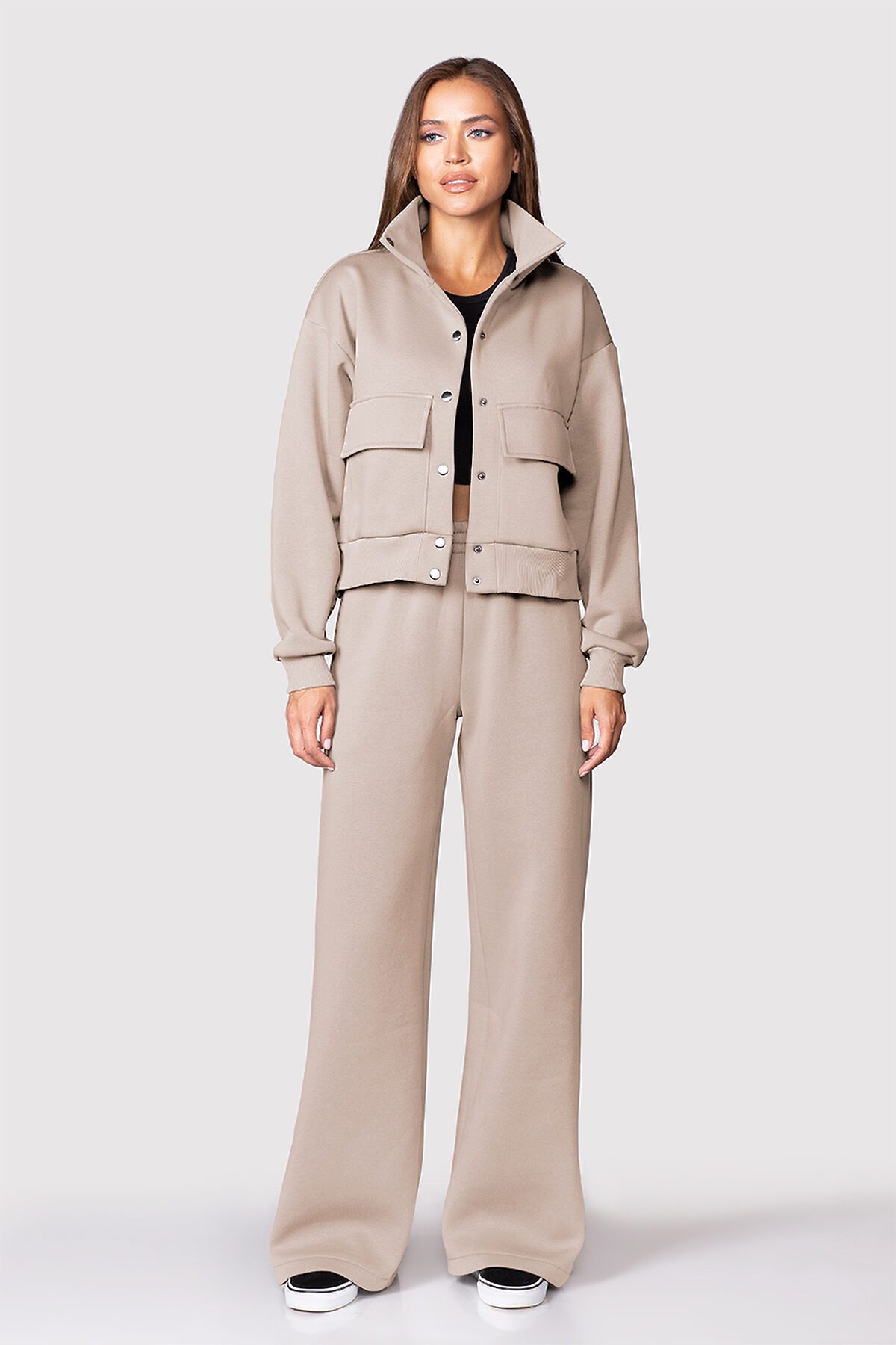 Жакет укороченный, свободного кроя, с длинным рукавом и высоким воротом стойкой. Застегивается на кнопки, с объемными накладными карманами с клапанами. Низ изделия и манжеты выполнены из эластичного фактурного материала.