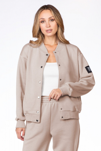 Жакет укороченный, свободного кроя, с длинным рукавом и высоким воротом стойкой. Застегивается на кнопки, с объемными накладными карманами с клапанами. Низ изделия и манжеты выполнены из эластичного фактурного материала.