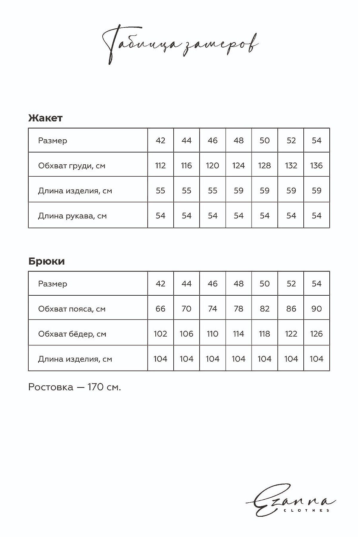 Костюм на стандартную ростовку 170см. Если это не Ваш рост, можно заказать отдельно брюки с необходимой ростовкой (164, 170, 176) и жакет.