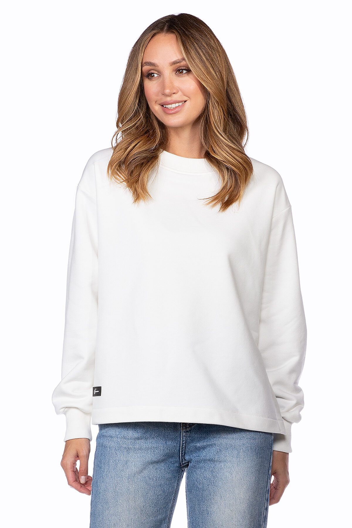 Свитшот свободного кроя, удлиненный по спинке, с длинным рукавом и боковыми разрезами. Отделка манжетов и горловины кашкорсе.