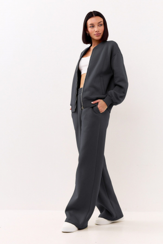одель свободного кроя, с втачным рукавом и округлым вырезом горловины. Бомбер застегивается на металлическую молнию, с удобными боковыми карманами. Низ изделия, манжеты и ворот выполнены из эластичного фактурного материала.
