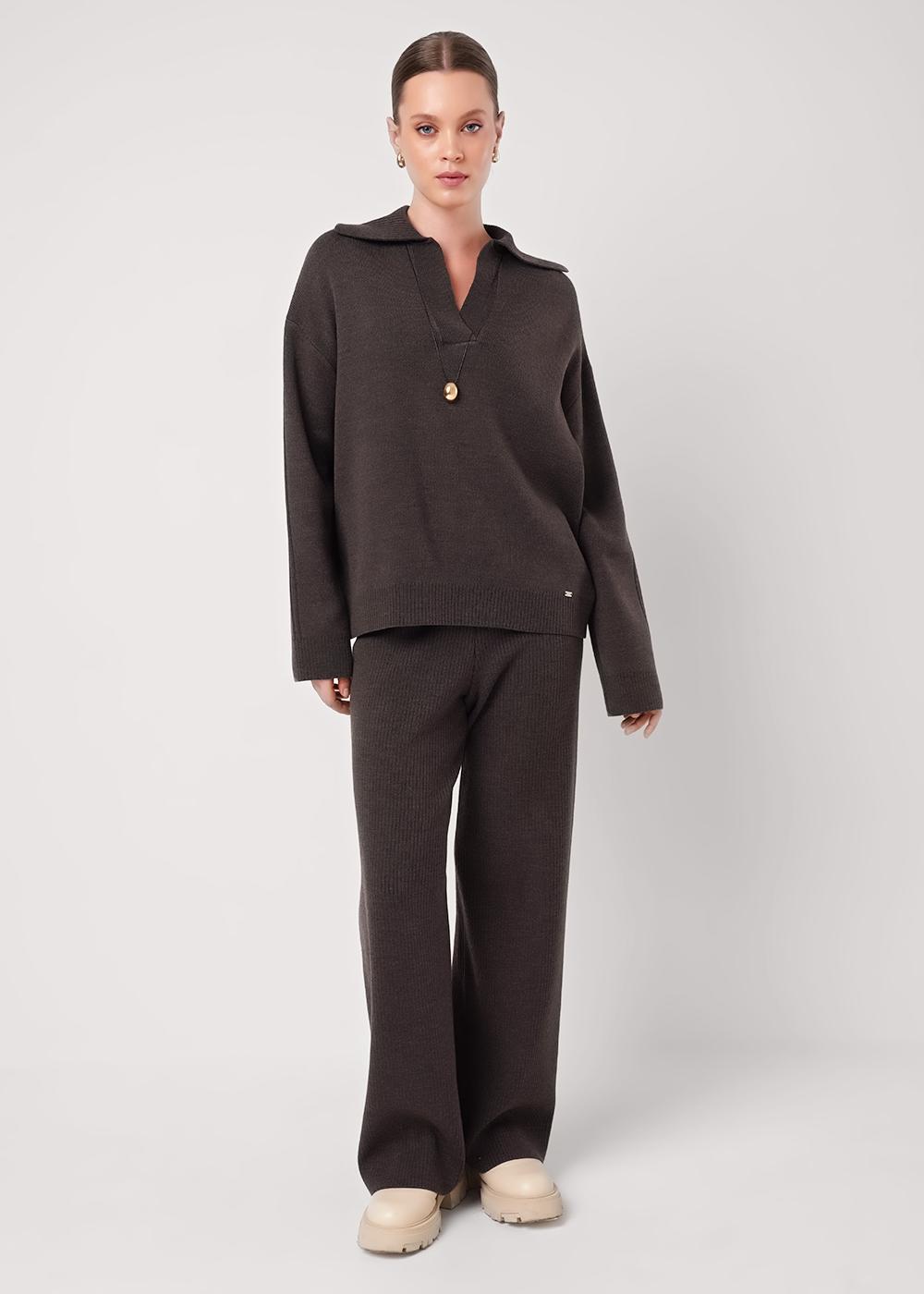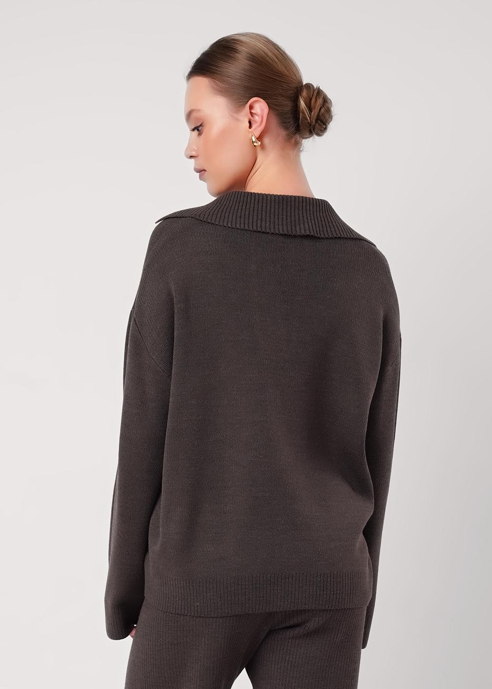 Вязаный джемпер из акриловой пряжи, переплетение гладь свободного силуэта. По горловине отложной воротник с планкой. Длинный рукав со спущенной линией плеча,вертикальные полосы. По низу изделия и рукавов манжеты. Нашивка металл.