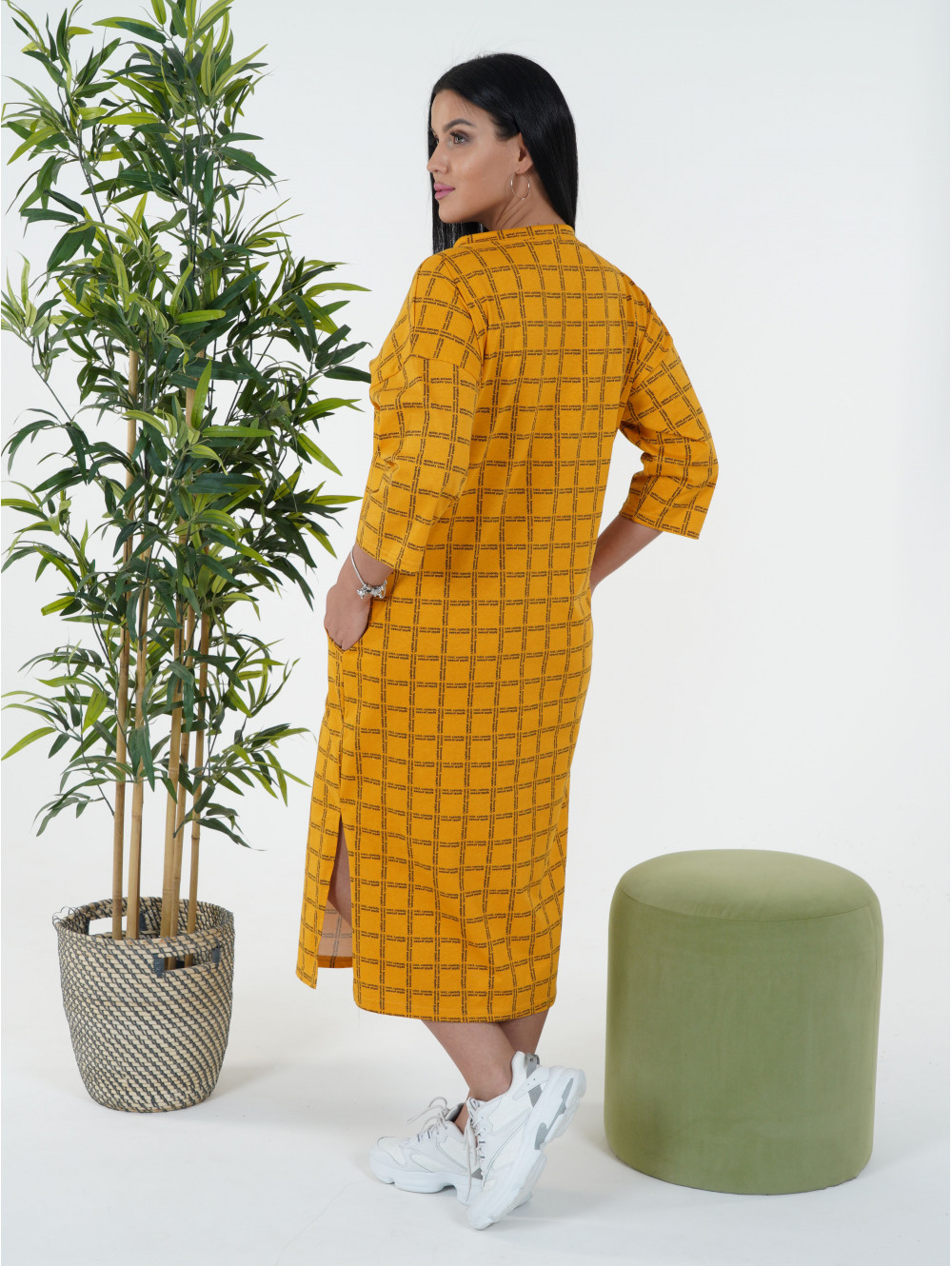 Оригинальное свободное платье с карманами и рукавом 3/4. В горловину вставлен шнурок с наконечниками. По бокам снизу изделия разрезы. В этом платье Вы будете чувствовать себя легко и свободно.