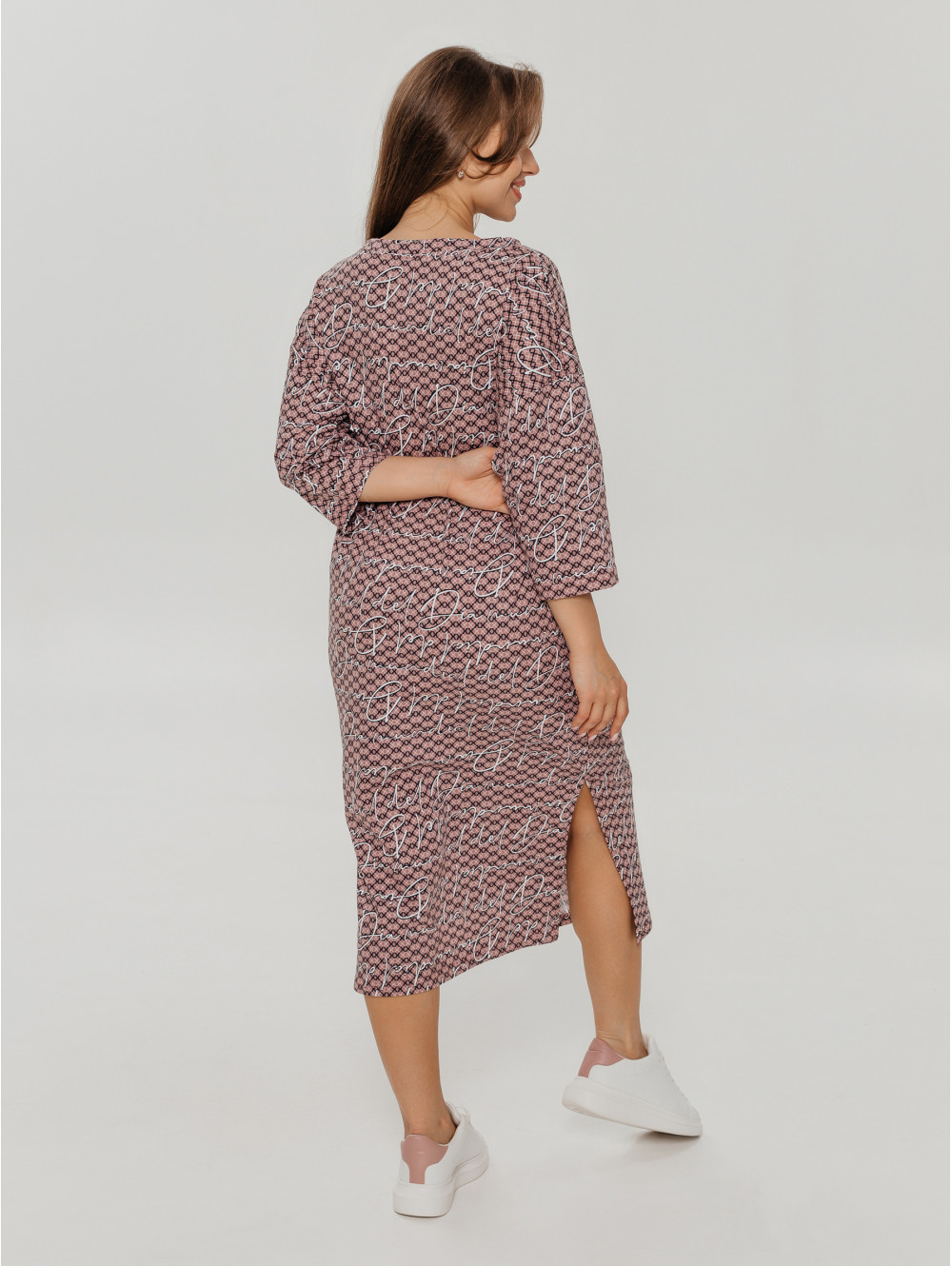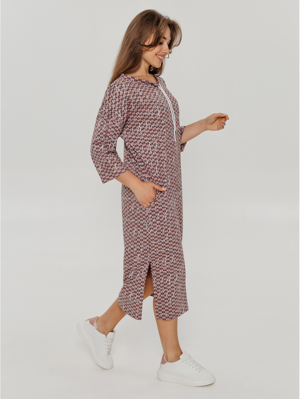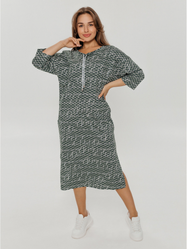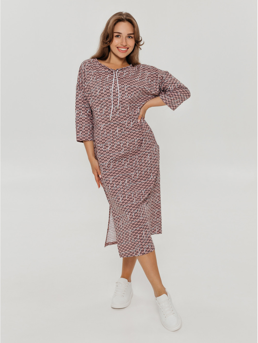 Оригинальное свободное платье с карманами и рукавом 3/4. В горловину вставлен шнурок с наконечниками. По бокам снизу изделия разрезы. В этом платье Вы будете чувствовать себя легко и свободно.