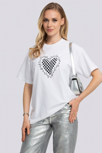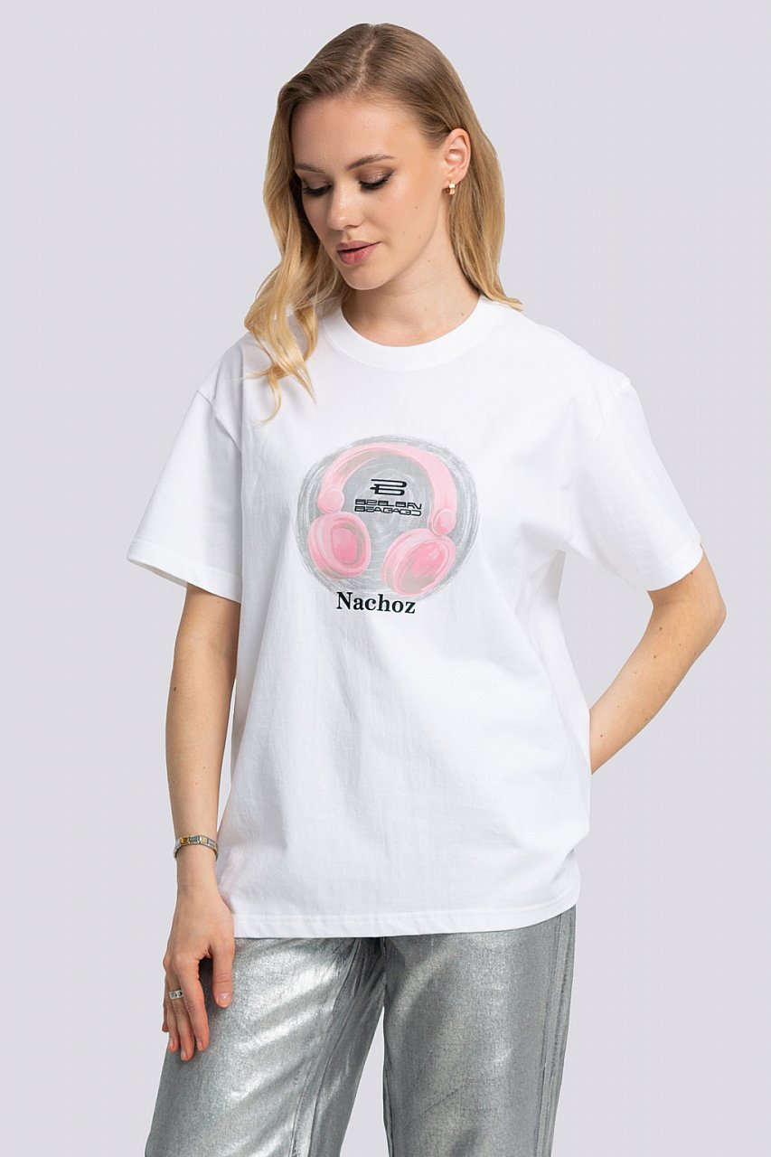Эта модная футболка с коротким рукавом - идеальный выбор для тех, кто следит за последними тенденциями в мире моды. Базовая, белая, но в то же время стильная. Принт на передней части делает её настоящим хитом сезона. Благодаря свободному крою и оверсайз-стилю, эта футболка будет комфортна и удобна в любых ситуациях. Универсальный дизайн позволяет сочетать её с различными видами одежды, создавая уникальные образы. Этот трендовый предмет одежды станет неотъемлемой частью гардероба любой молодой женщины.