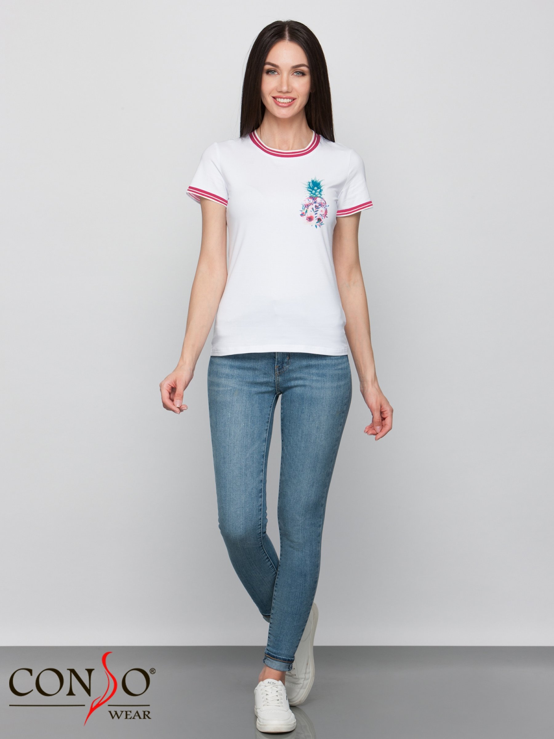 Модная футболка приталенного силуэта с контрастной отделкой по рукавам и горловине. Яркий принт «Ананас» дополняет дизайн модели. 95% хлопок, 5% эластан