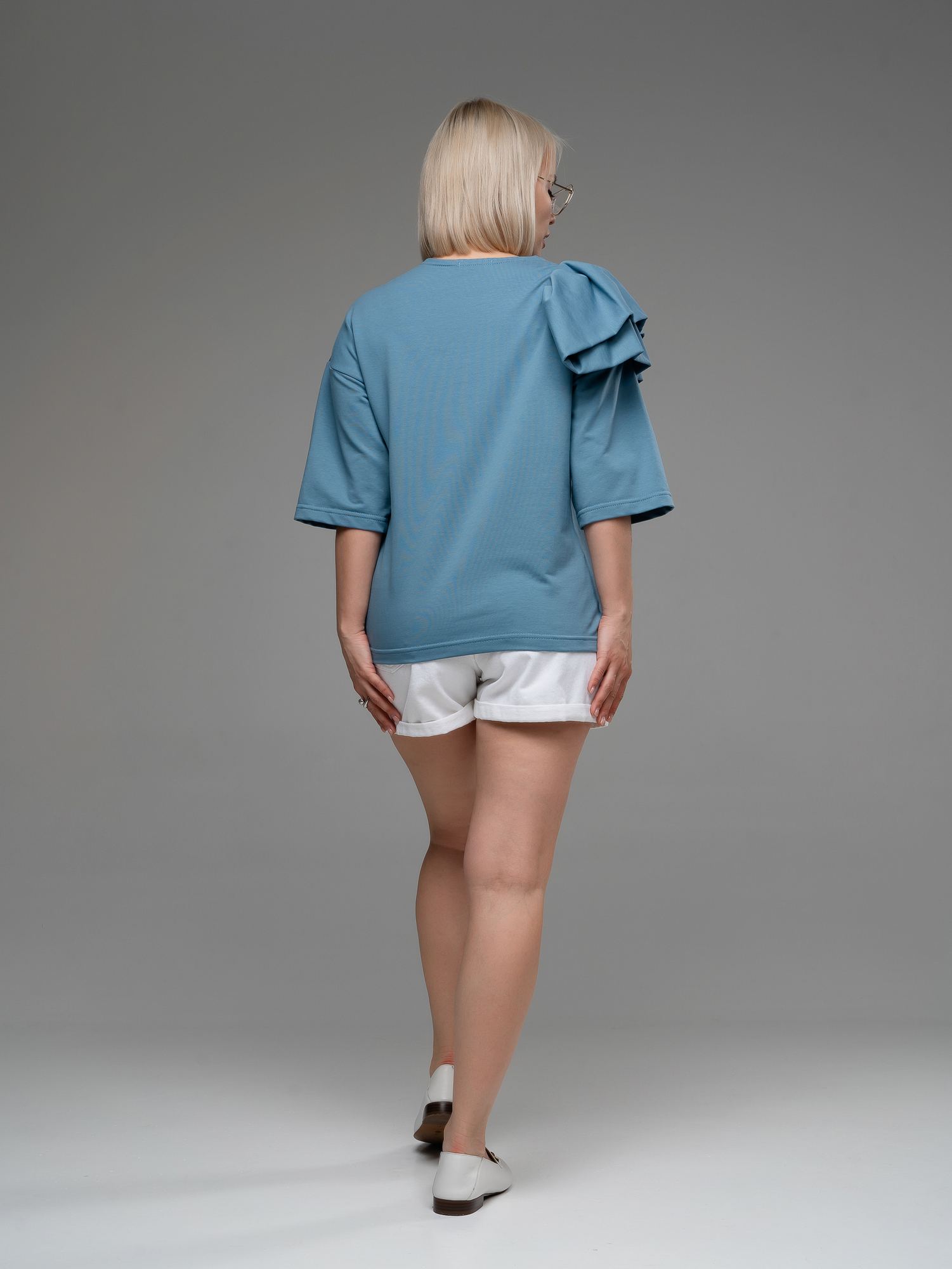 Футболка женская из футера Блюстоун цвета в стиле Оверсайз , рукавами длиной до локтя и объемным воланом на плече . Высокое содержание хлопка в составе 92 % позволит почувствовать максимальный комфорт и уверенность в себе, а добавление эластана 8 % придаcт этому изделию дополнительную прочность и износостойкость. Оверсайз стиль, рукава длиной до локтя и объемный волан - сделают элегантным ваш образ. Вы будете выглядеть превосходно в любой ситуации - будь это повседневный или наряд или для праздничных и вечерних выходов. Свободная, удлиненная футболка идеальный вариант для летнего периода. Благодаря своей универсальности данную модель можно носить как футболку с рюшами или женскую блузку. Изделие выполнено из трикотажа премиального качества - ПЕНЬЕ, с содержанием хлопка более 92%