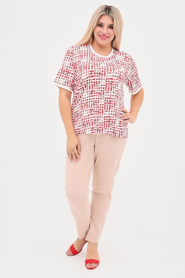 розовый Стильная футболка приталенного силуэта из вискозного трикотажа в яркий принт.  Круглый вырез горловины и короткие втачные рукава, дополнены бейкой из однотонного трикотажа. Низ изделия прямой. Модель отлично сочетается с джинсами, брюками или юбками. Яркий и комфортный вариант для жаркого лета!