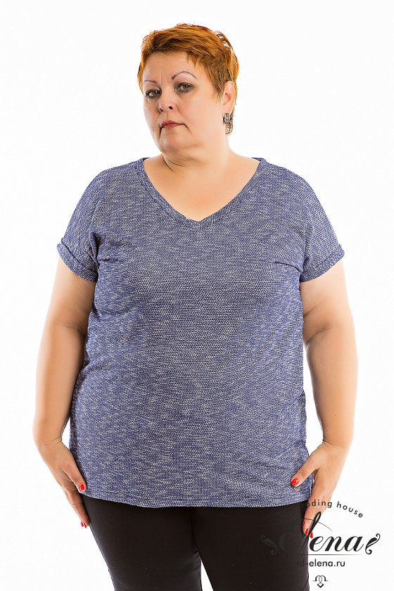 Футболка выполнена из вязаного полотна (набивка "цветные разводы"). Со спущенным плечом и мягким V-образным вырезом, обработанным планкой. По низу рукавов отложная планка. Низ изделия разноуровневый, спинка длиннее полочки. На спинке шов.